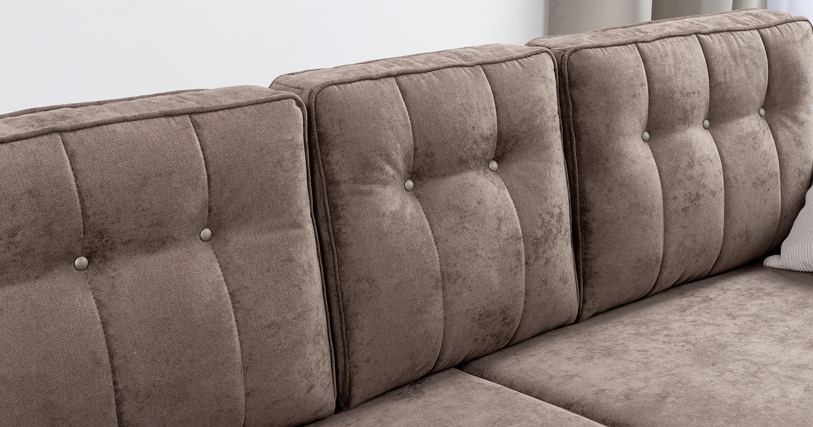 Подушки имеют трапециевидную форму, с утолщением к низу для комфорта посадки. Кант по всему периметру подушек, декоративные утяжки металлическими пуговицами, вертикальная стежка.