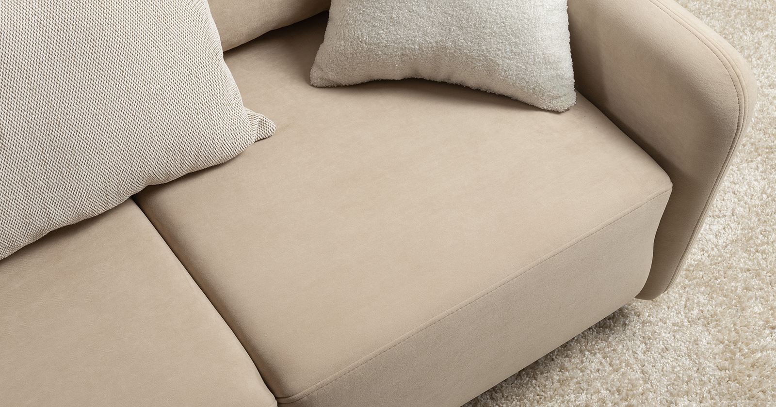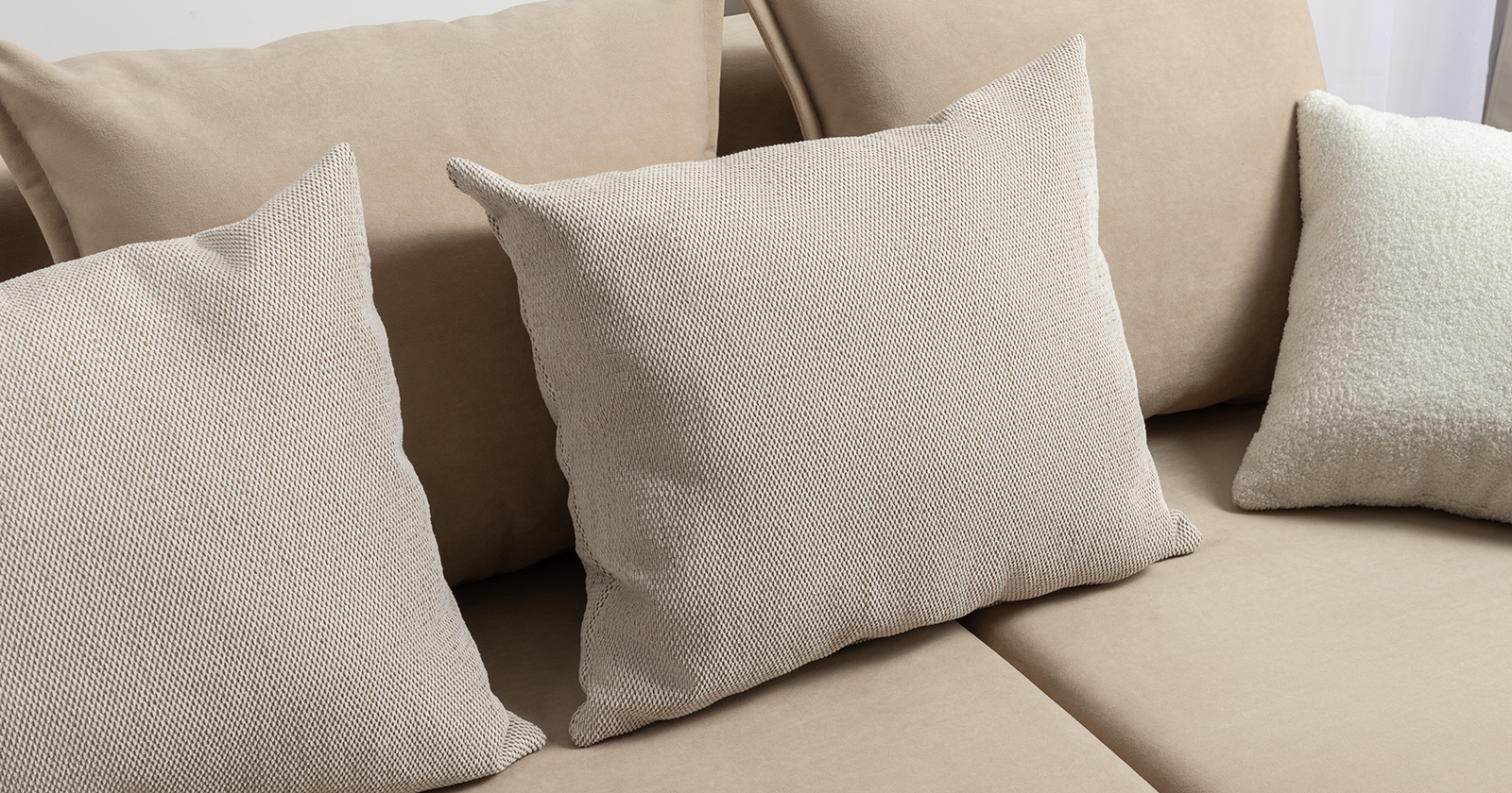 В комплекте 5 двусторонних приспинных подушки и 2 декоративные думки. Задняя спинка в ткани основы. Декоративные отделочные строчки по боковинам и сиденью