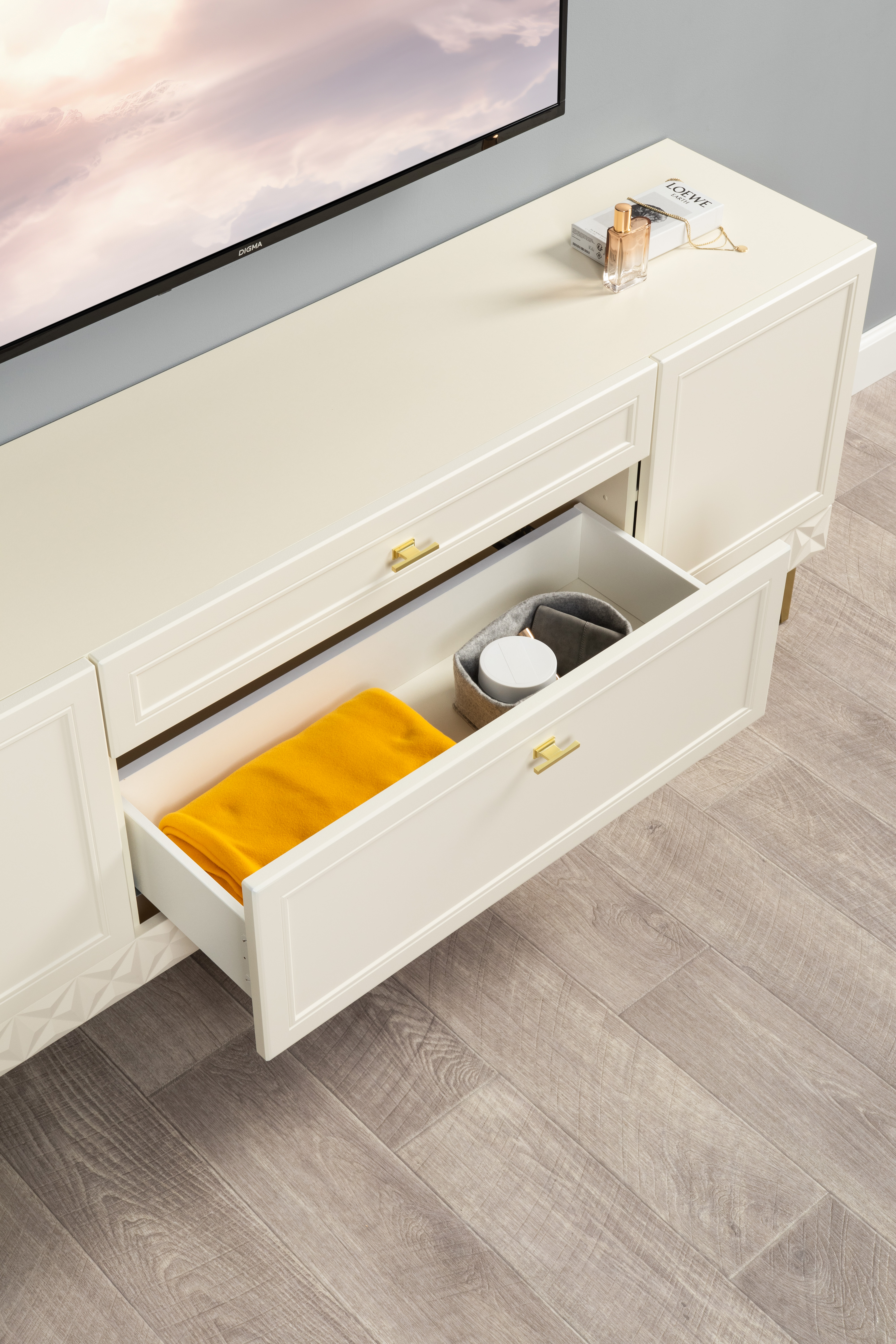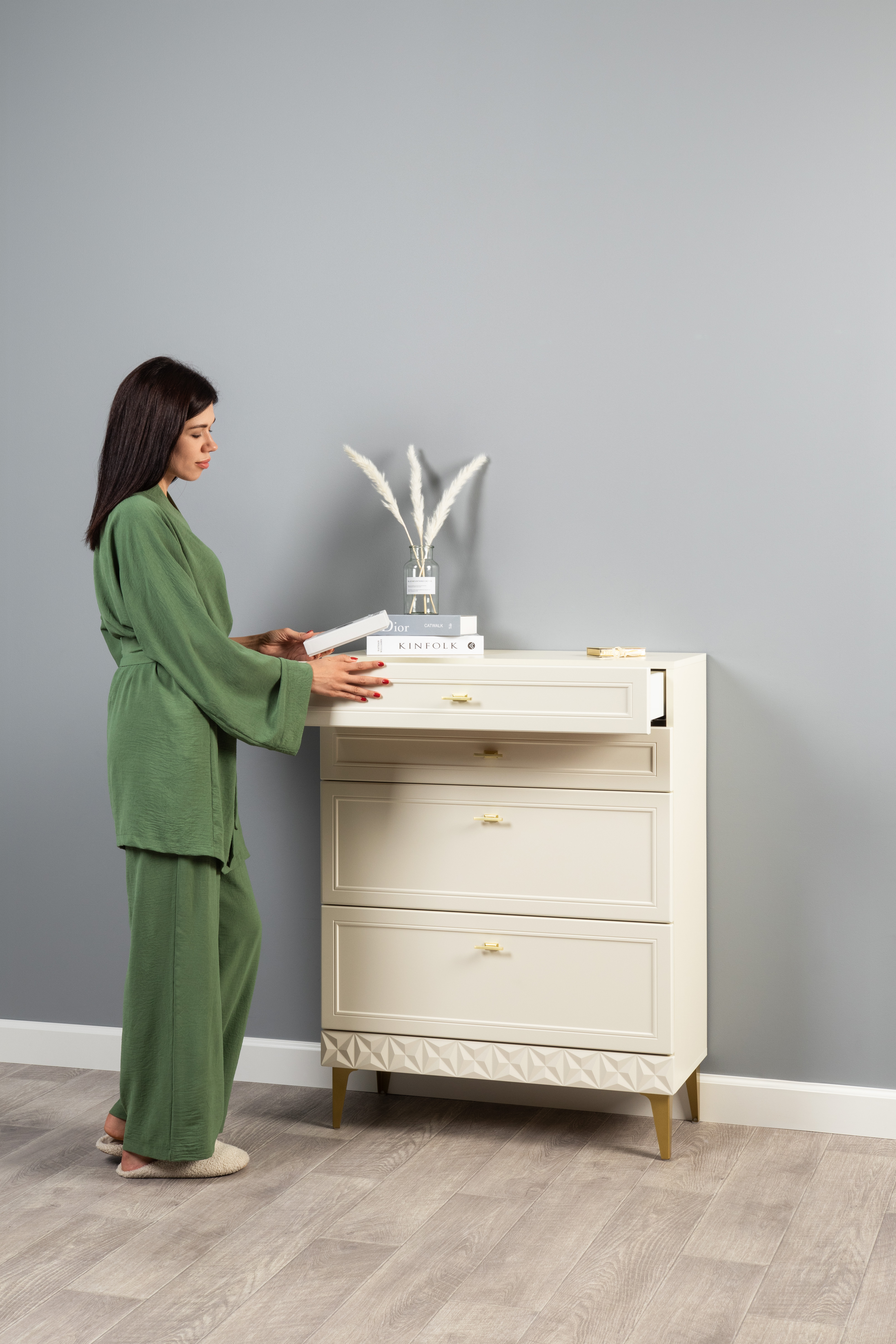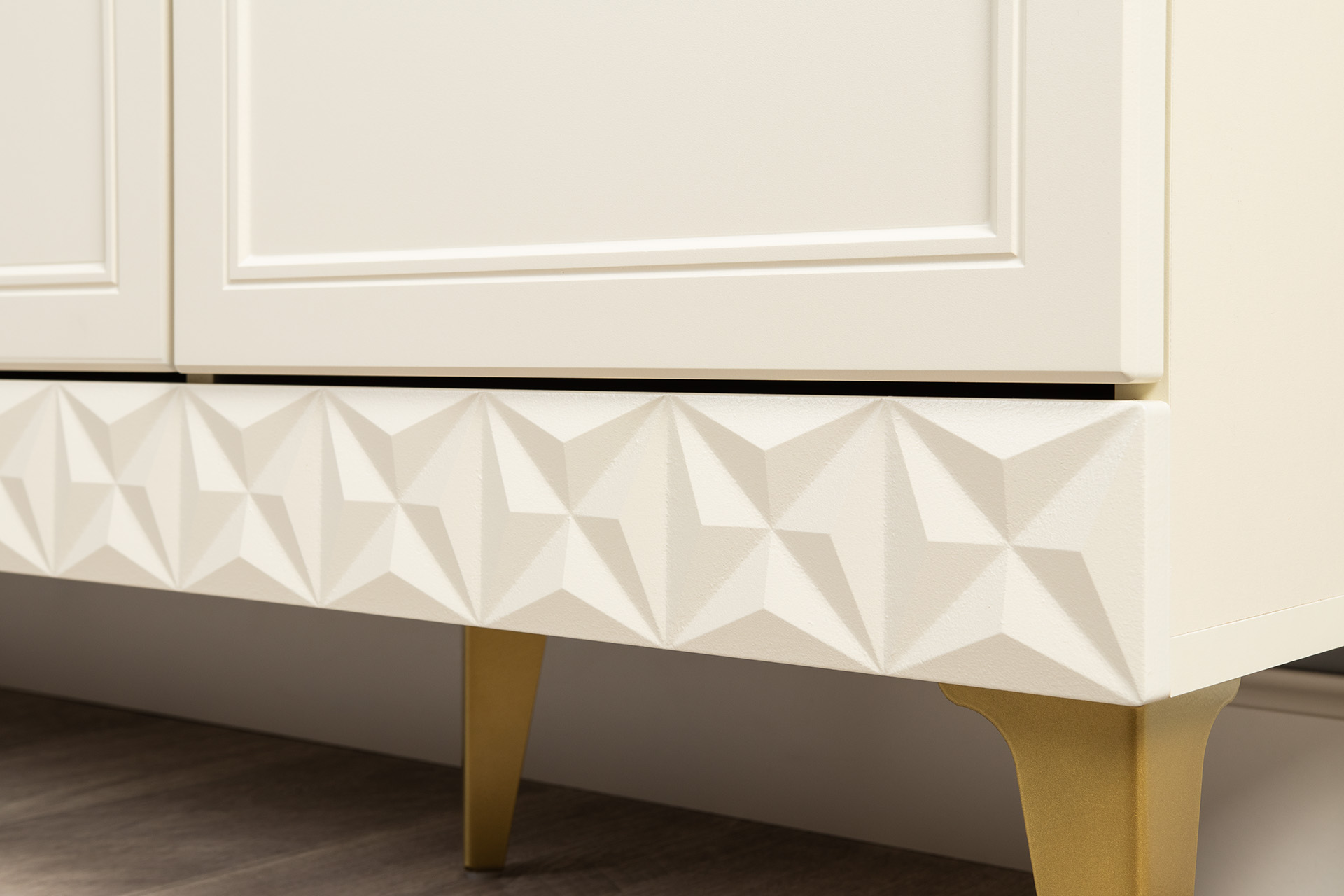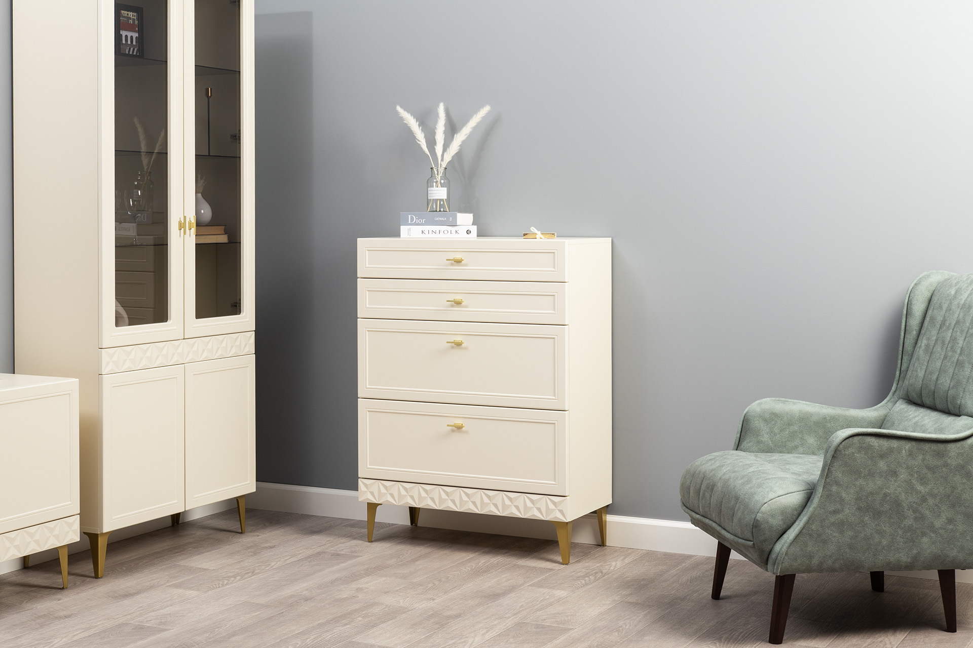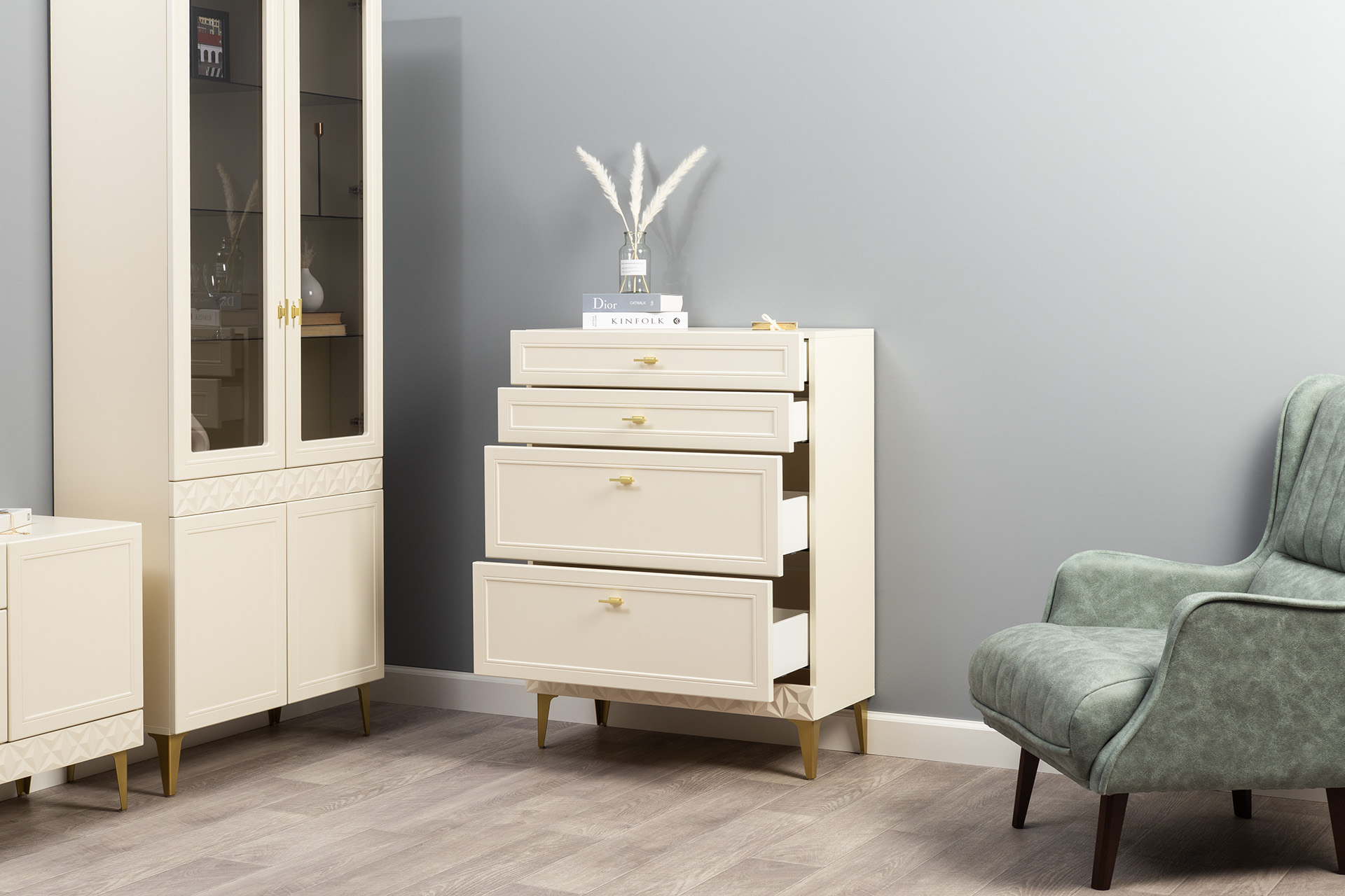 Изящные линии, глубокая фрезеровка фасадов из МДФ и благородные оттенки. Утончённая «Слоновая кость» и изысканная «Олива Шагрень» с глубоким зелёным тоном — создают атмосферу уюта, тепла и благородства. Металлические ручки и опоры золотого цвета придают мебели утончённый блеск, а петли и направляющие с доводчиками обеспечивают плавное и бесшумное закрытие фасадов.