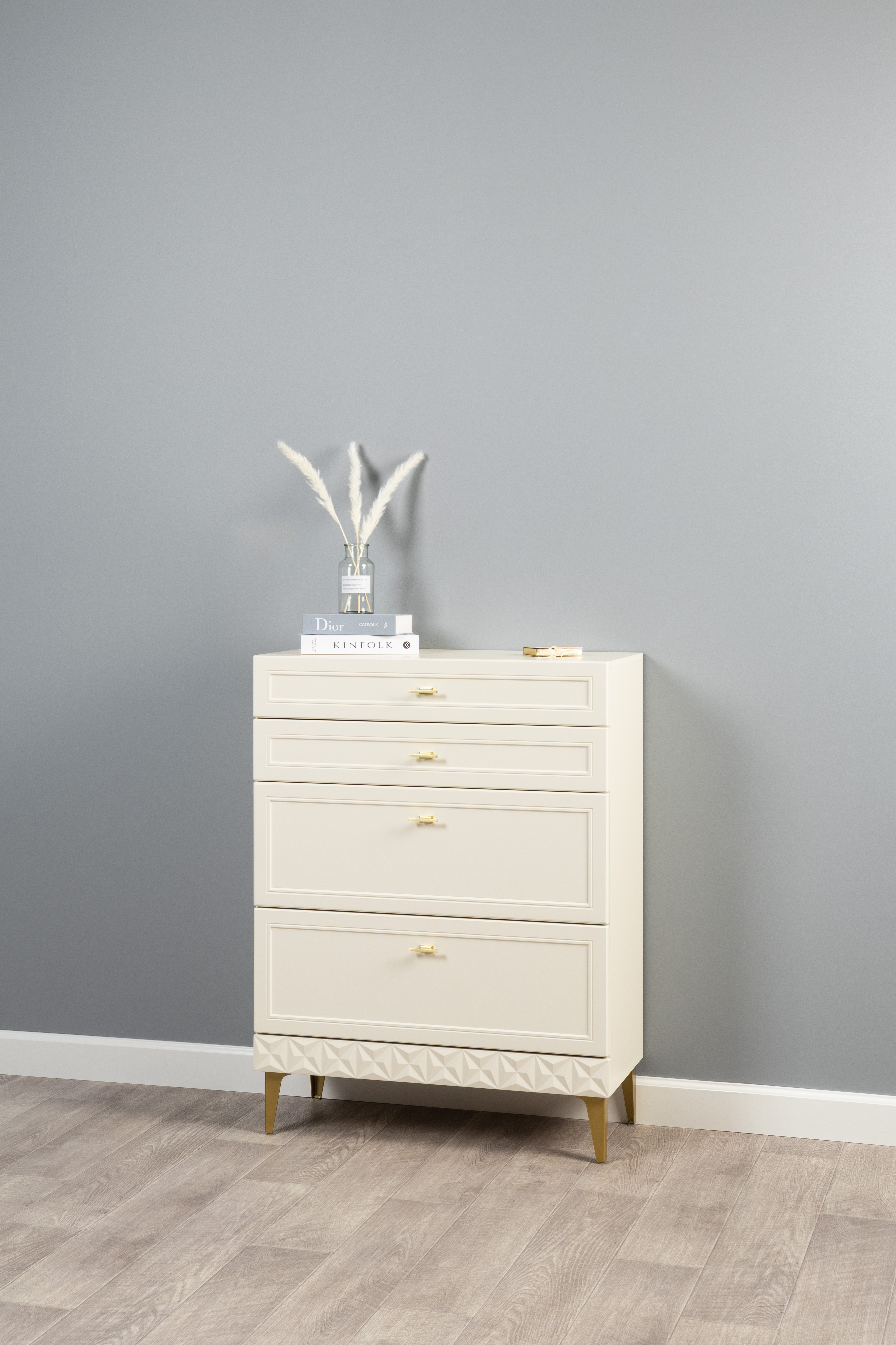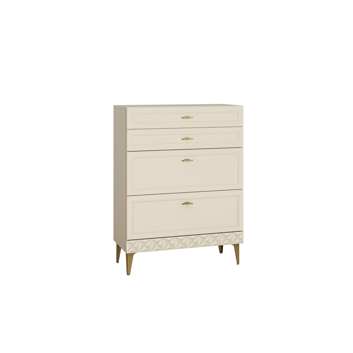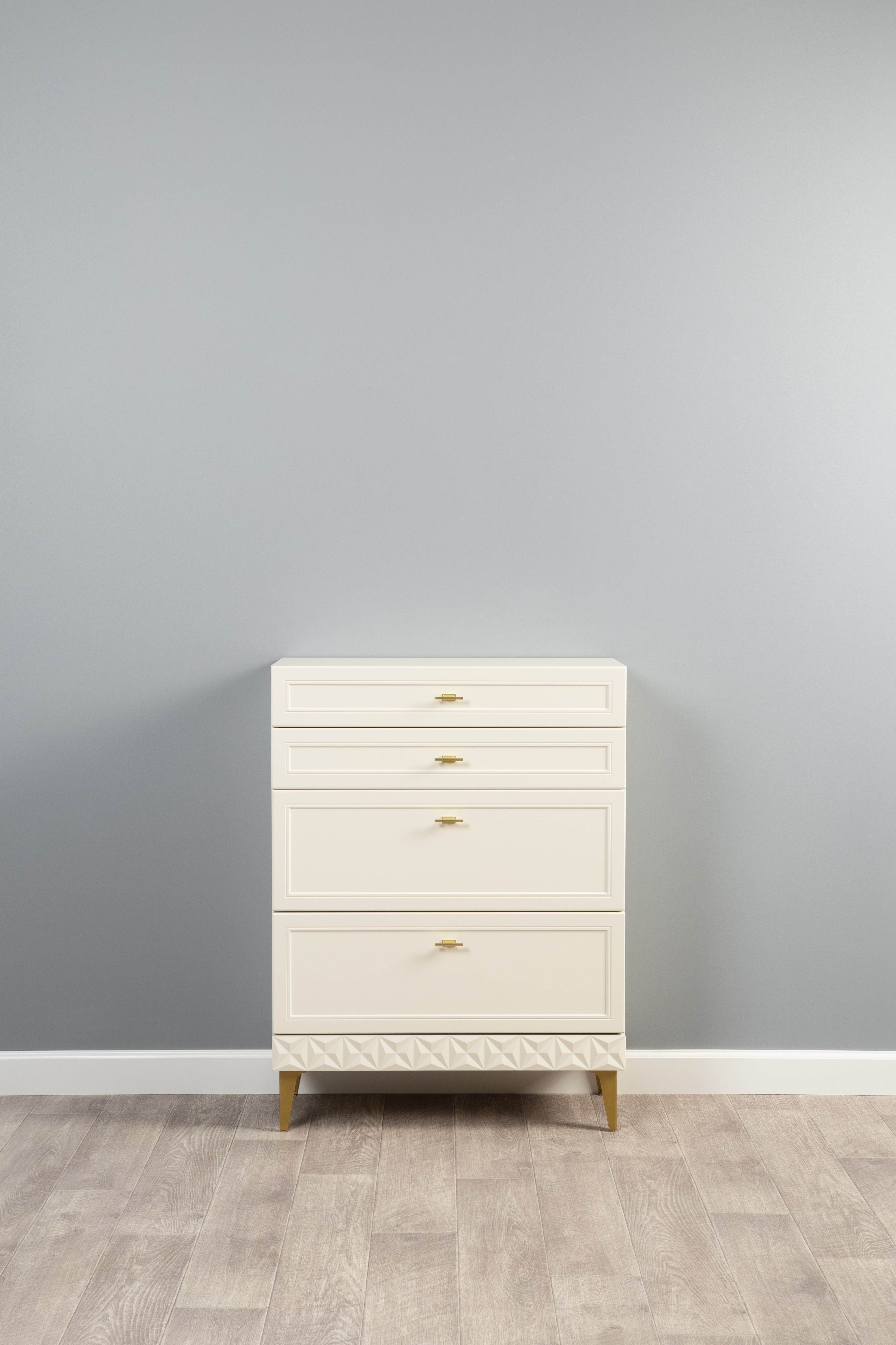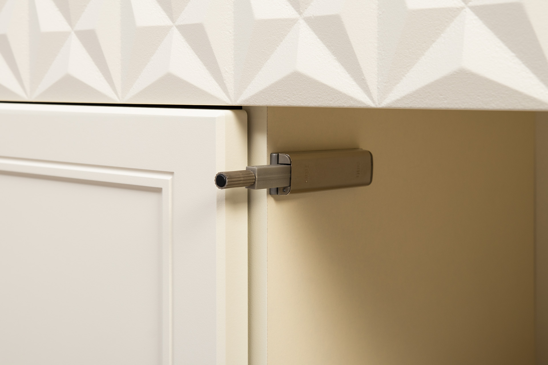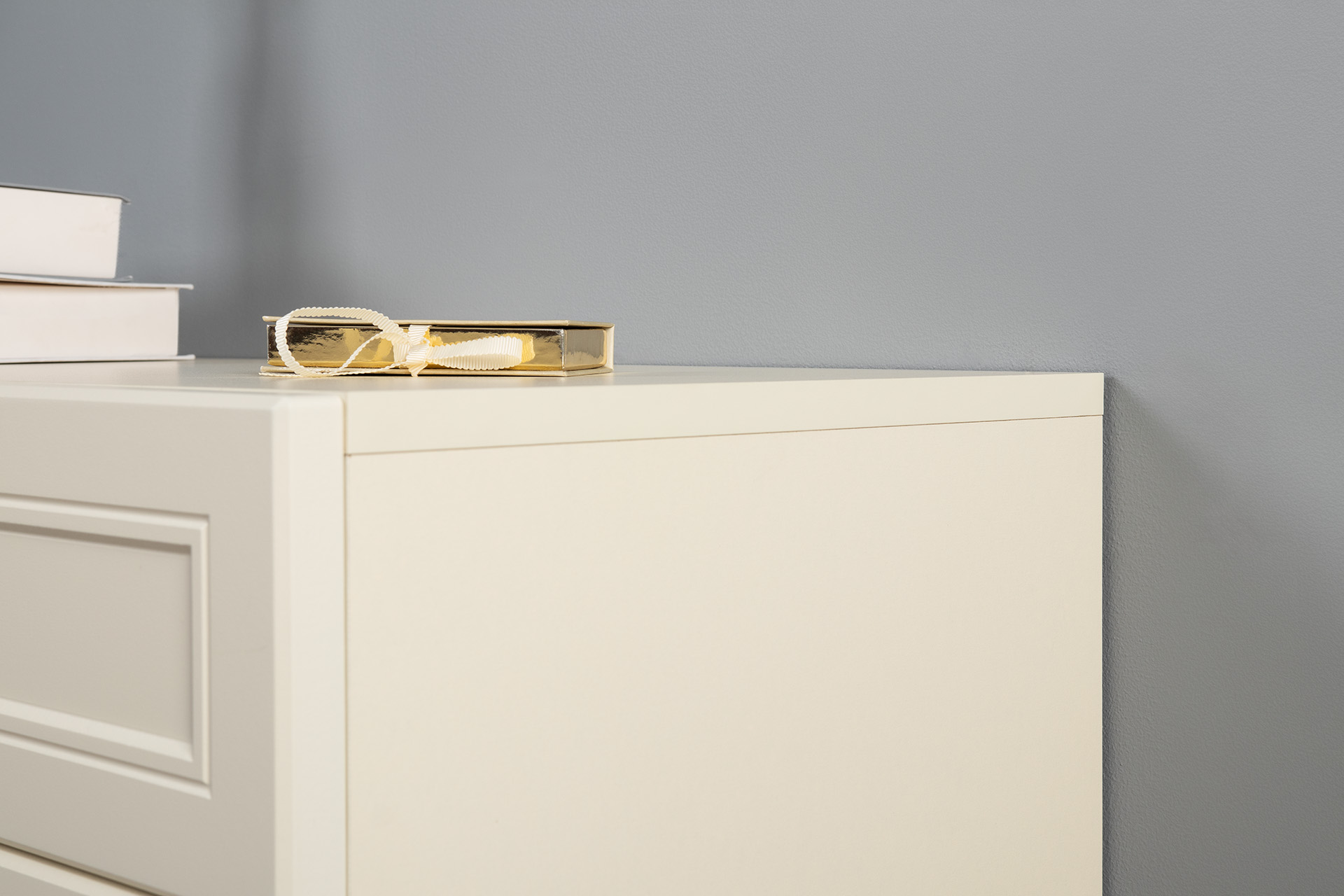 Изящные линии, глубокая фрезеровка фасадов из МДФ и благородные оттенки. Утончённая «Слоновая кость» и изысканная «Олива Шагрень» с глубоким зелёным тоном — создают атмосферу уюта, тепла и благородства. Металлические ручки и опоры золотого цвета придают мебели утончённый блеск, а петли и направляющие с доводчиками обеспечивают плавное и бесшумное закрытие фасадов.