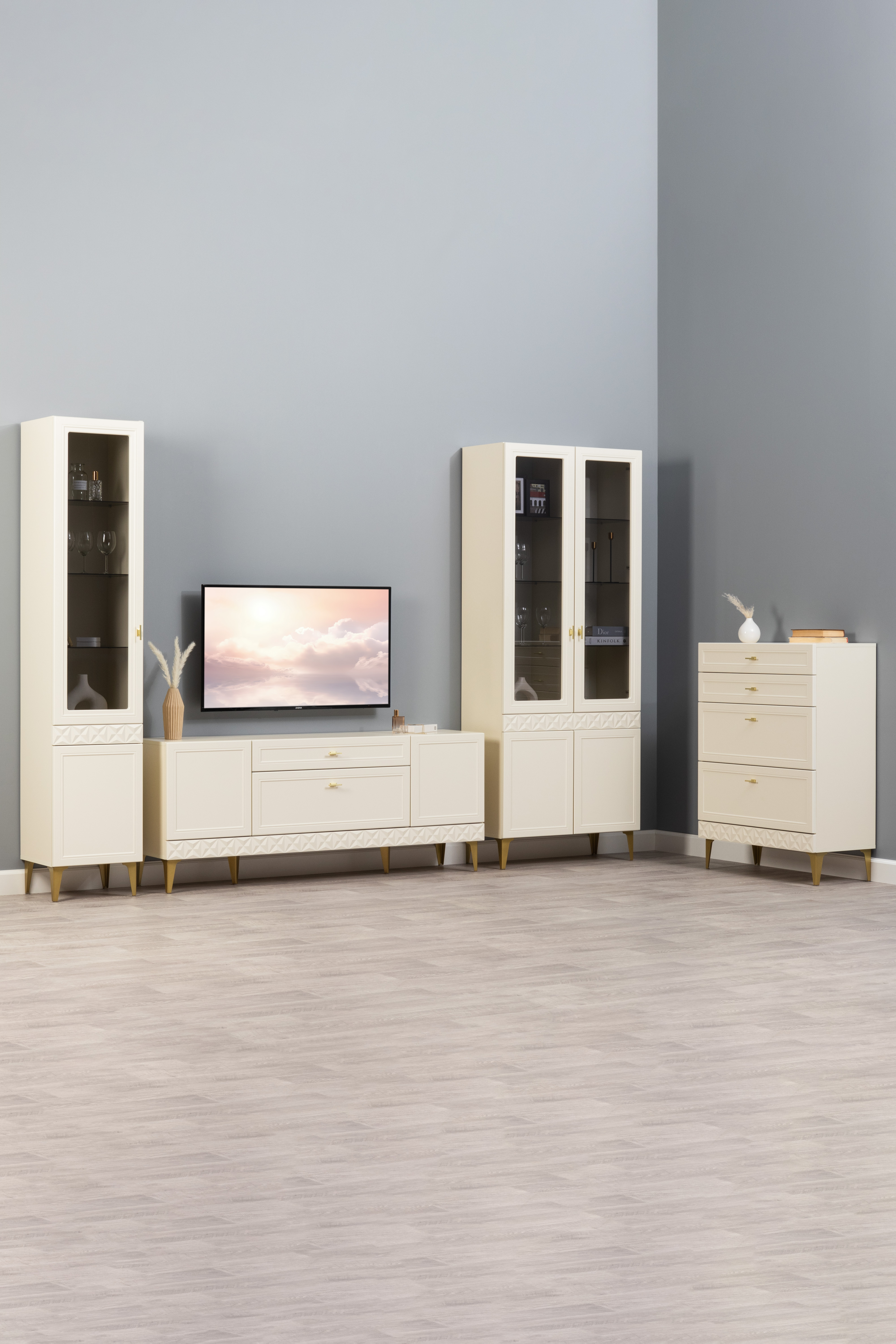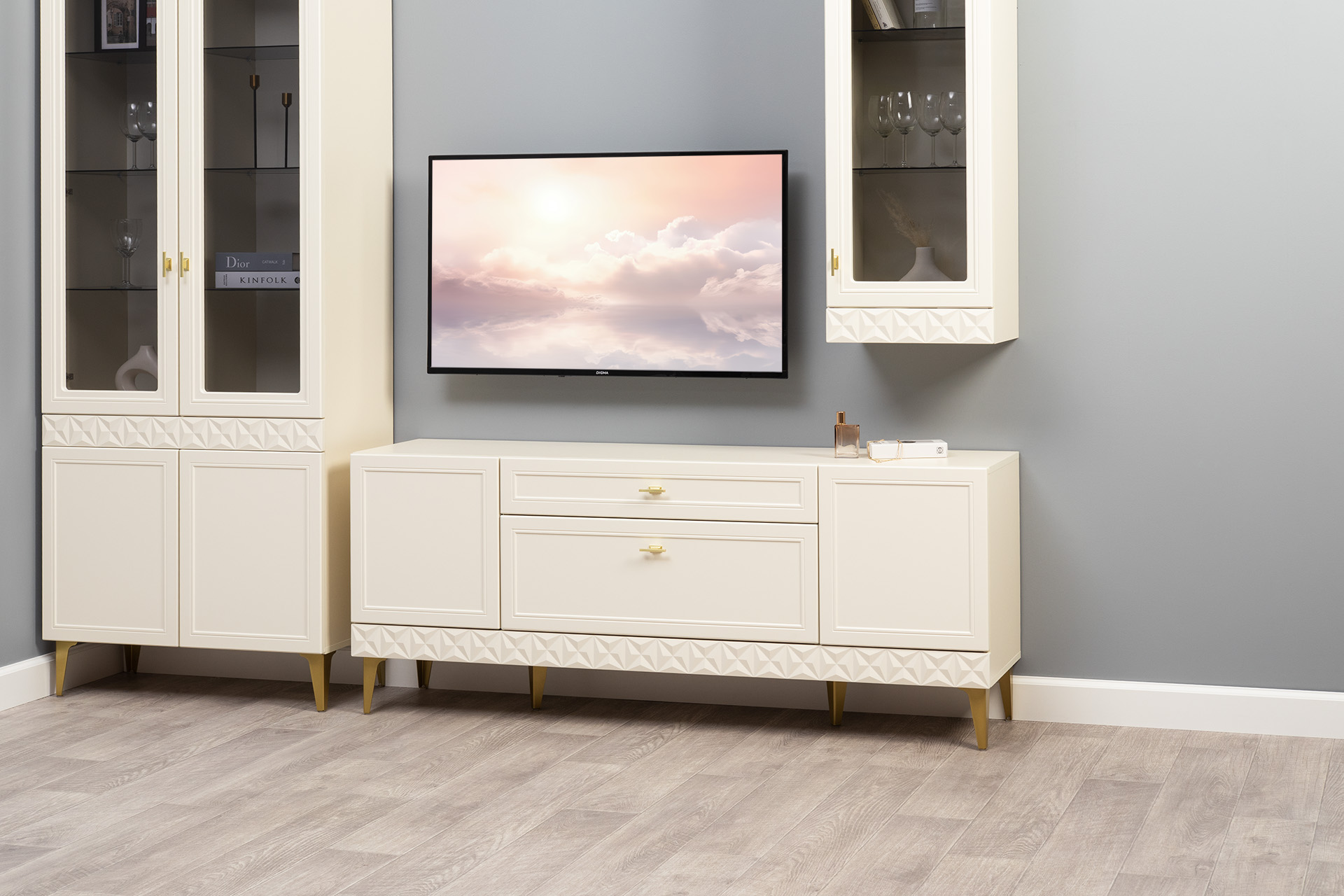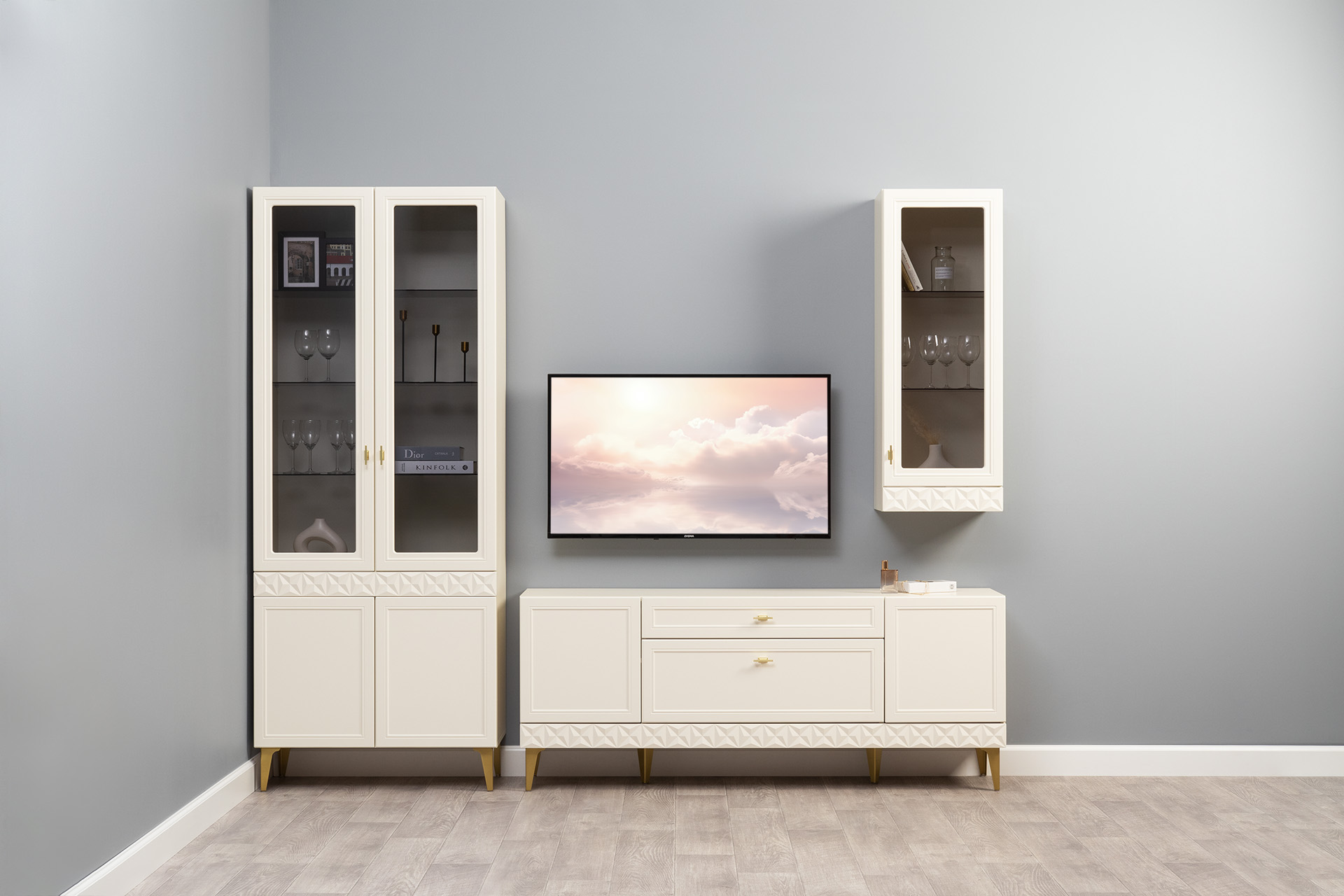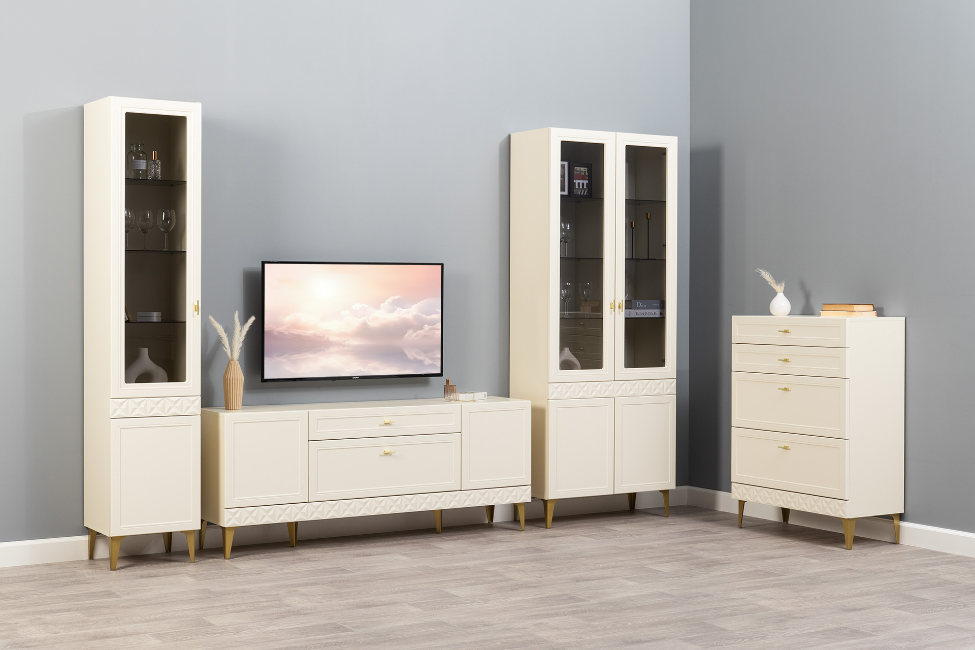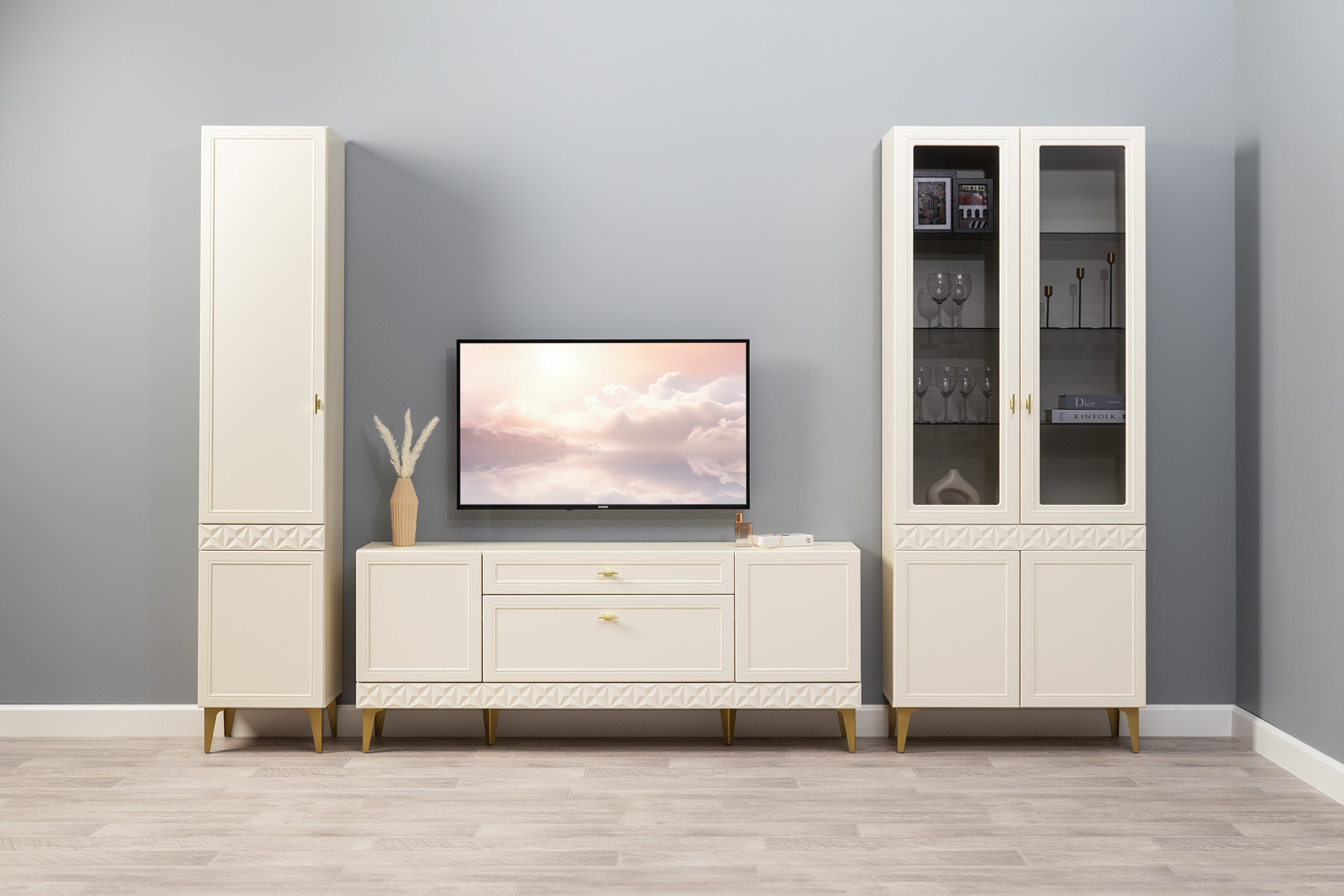 Гостиная Марион композиция 1 слоновая кость С341 PE, слоновая кость 6898 ПВХ, белый PE шагрень (собирается на любую сторону)