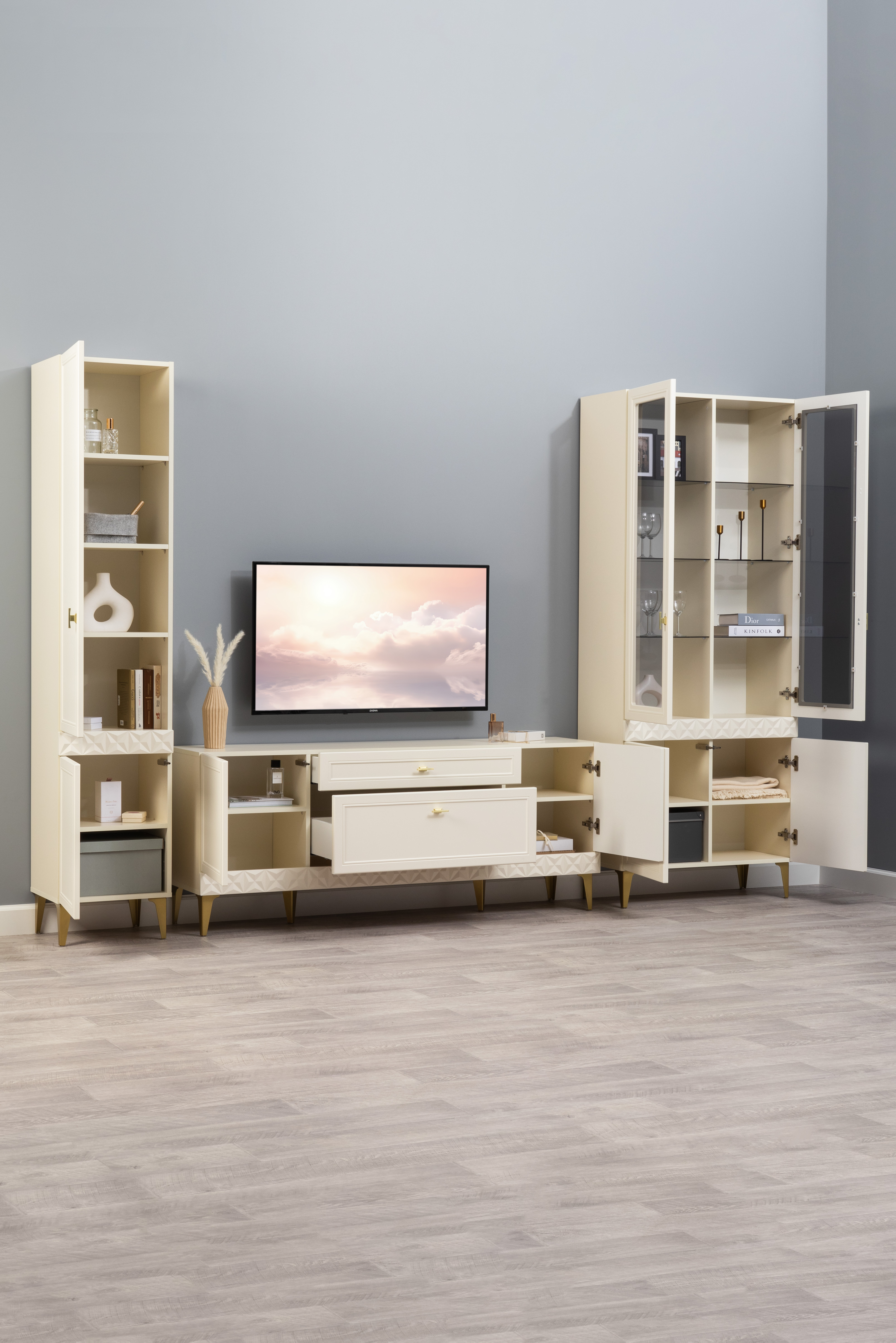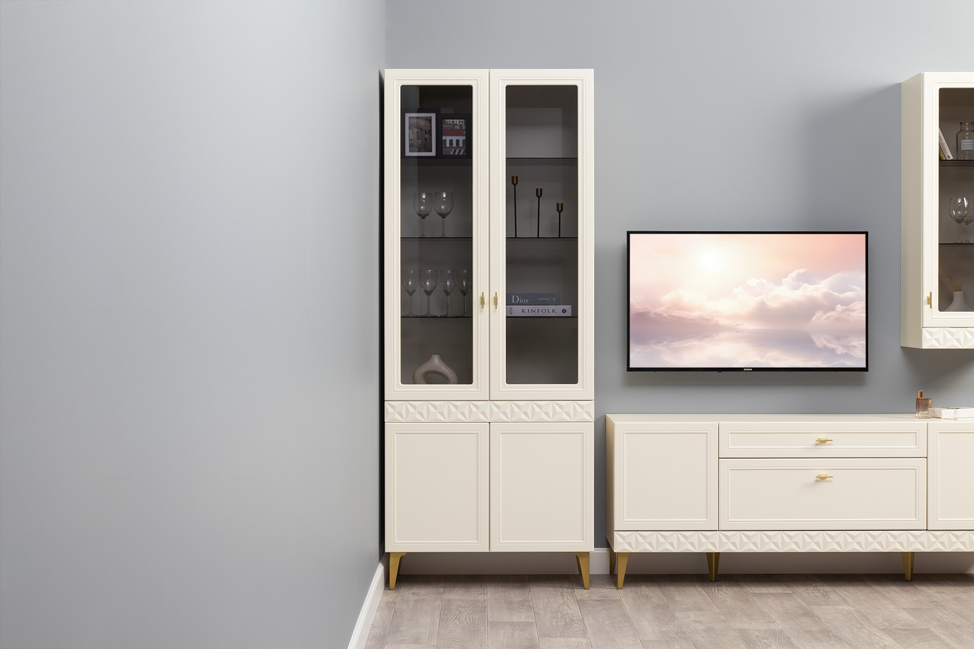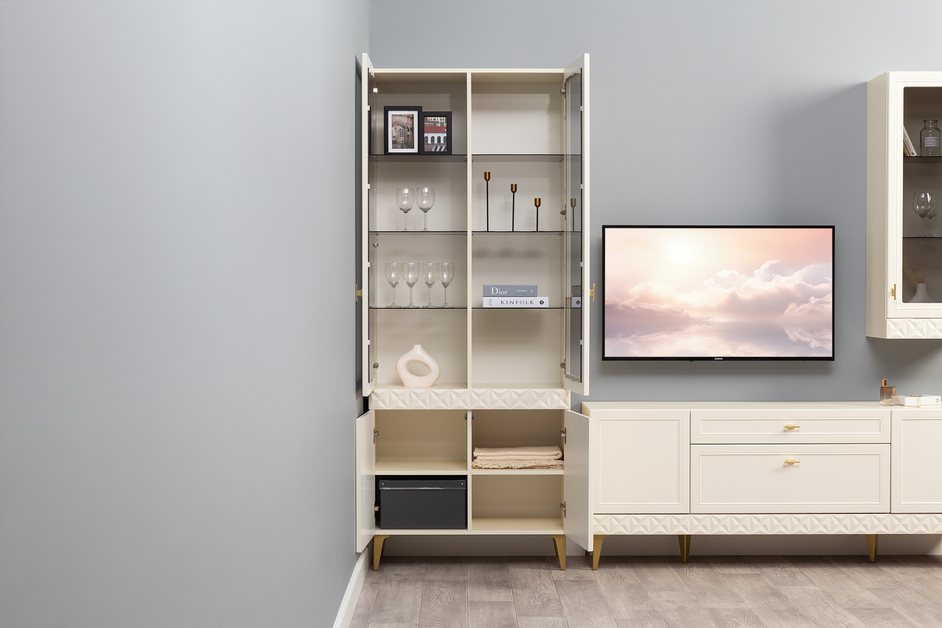 В коллекции представлены три типа витрин с тонированным закалённым стеклом, которые придают пространству лёгкость и свет. «Марион» — идеальное сочетание традиций и актуального дизайна в каждой детали.