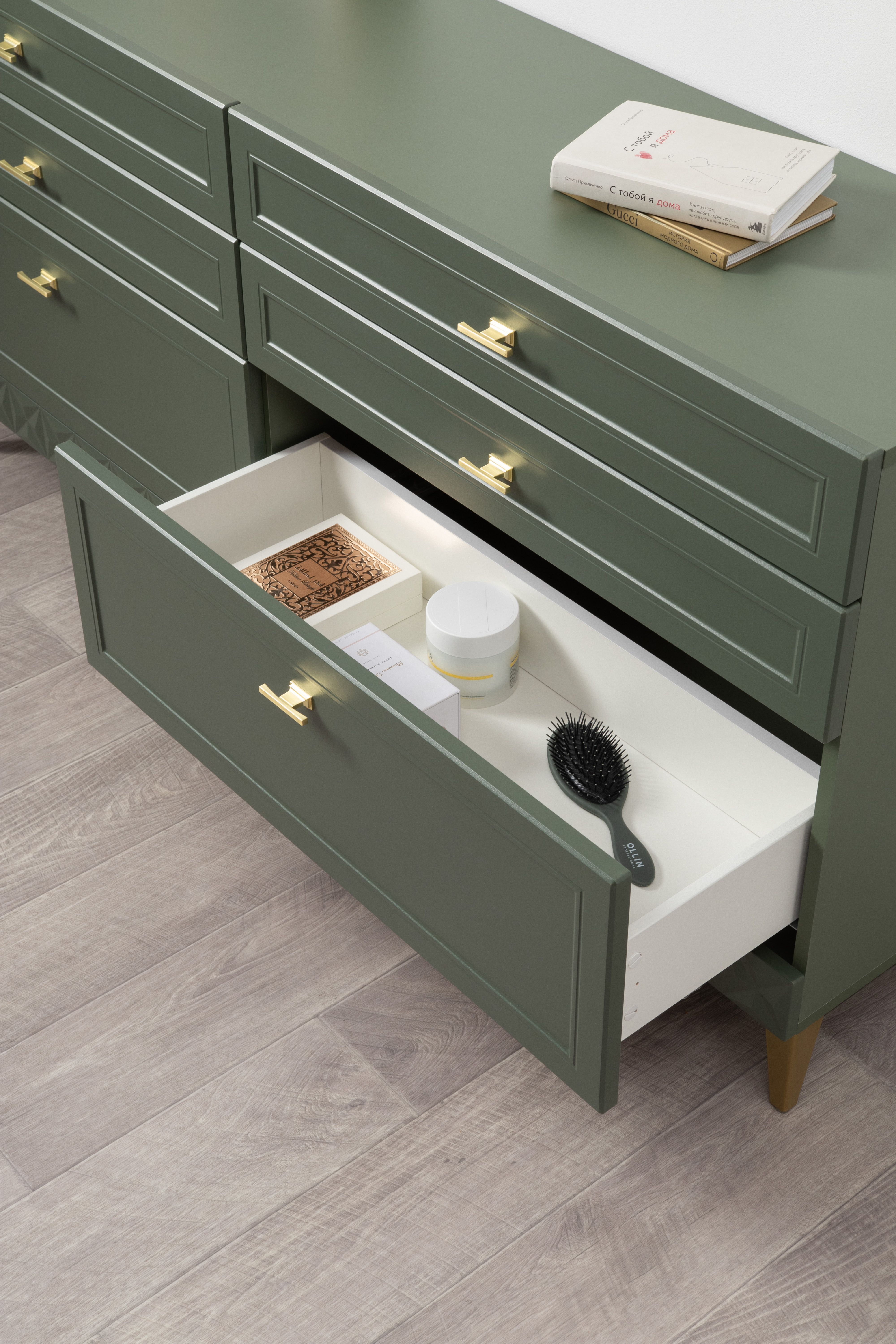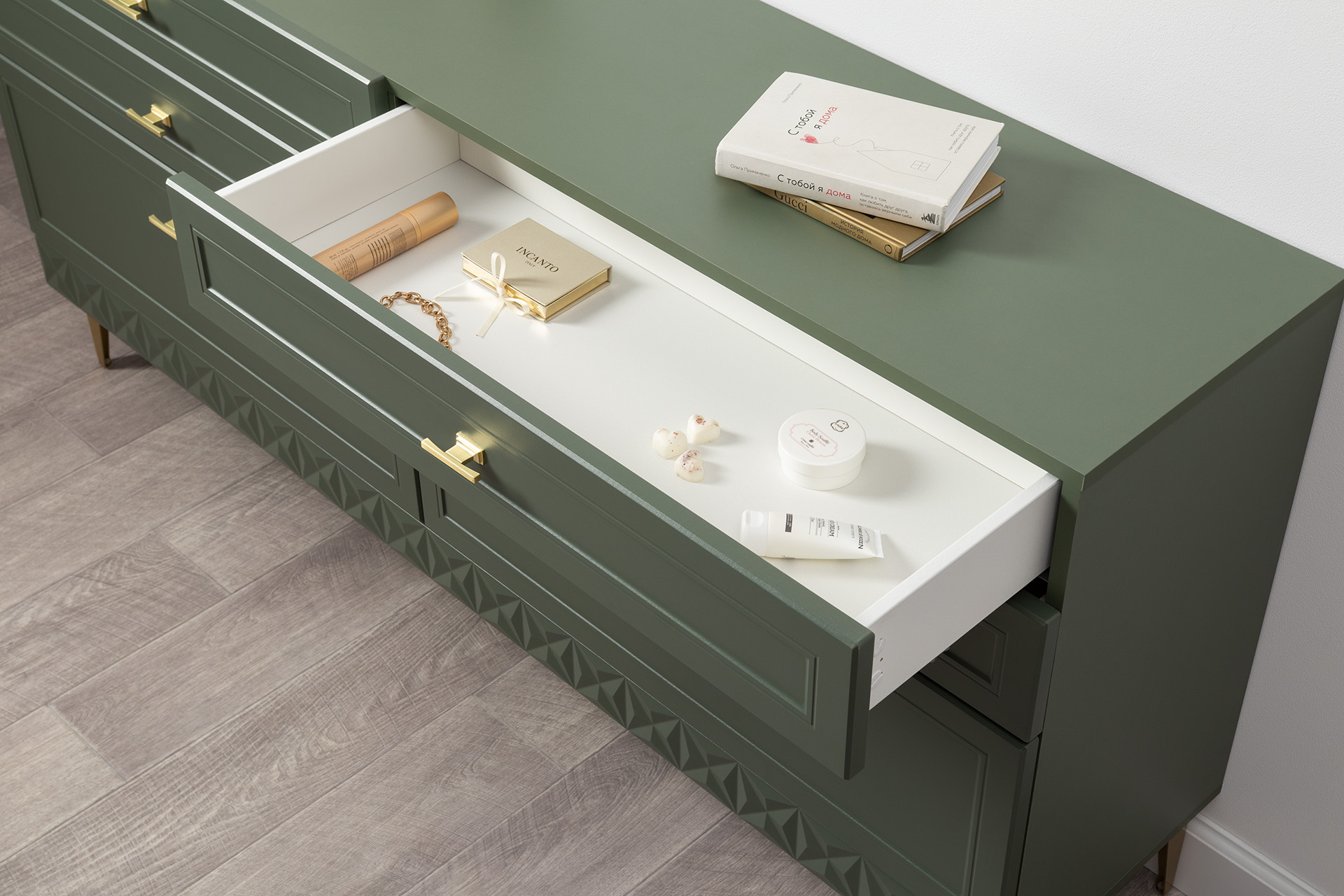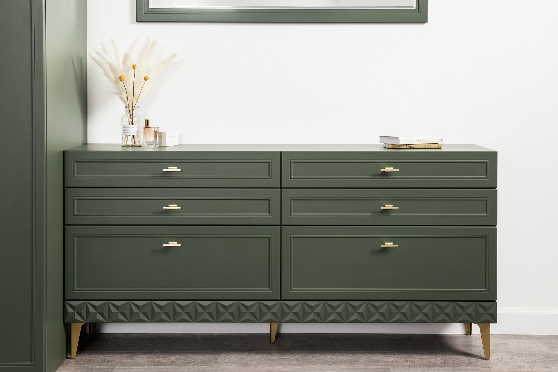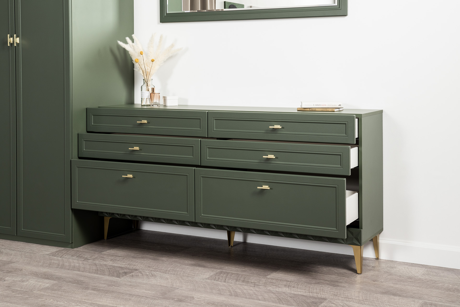 Комод Марион 16.256 дымчатый зеленый K521, олива шагрень AG 1050 ПВХ, белый PE шагрень