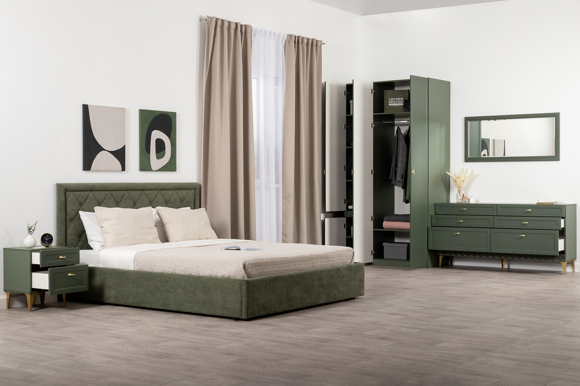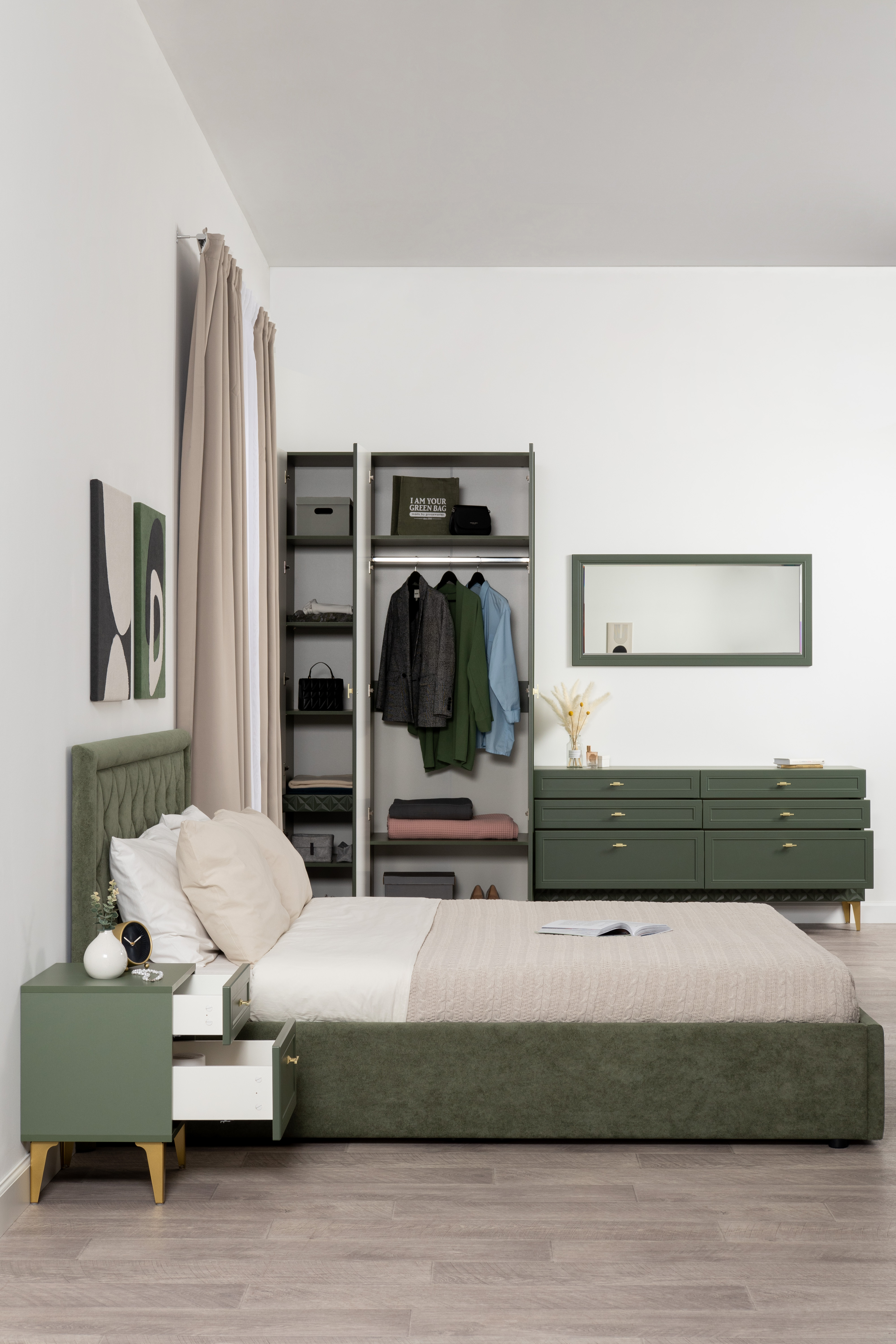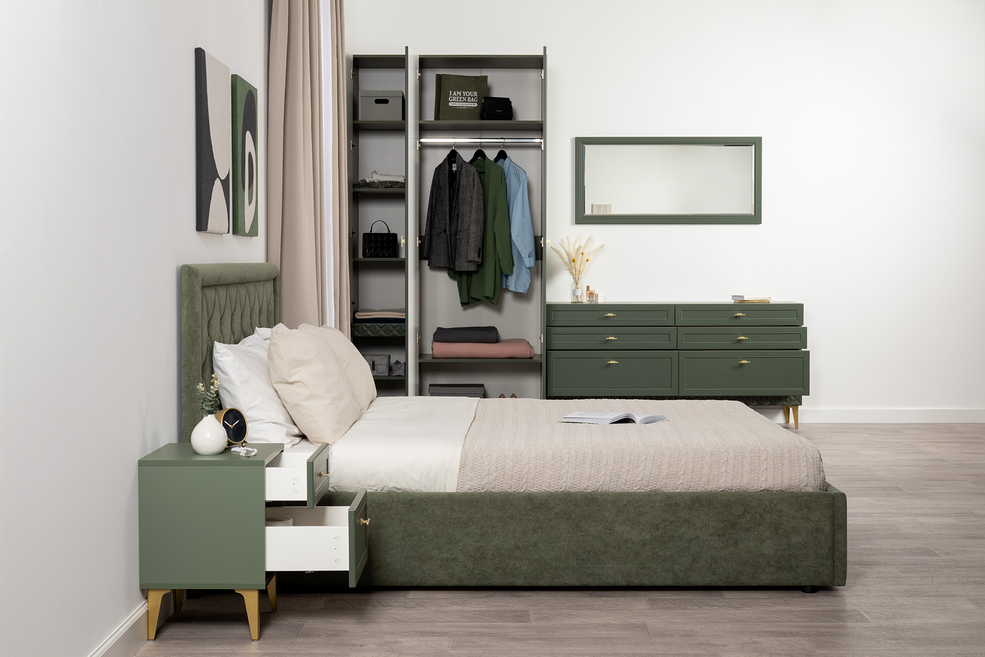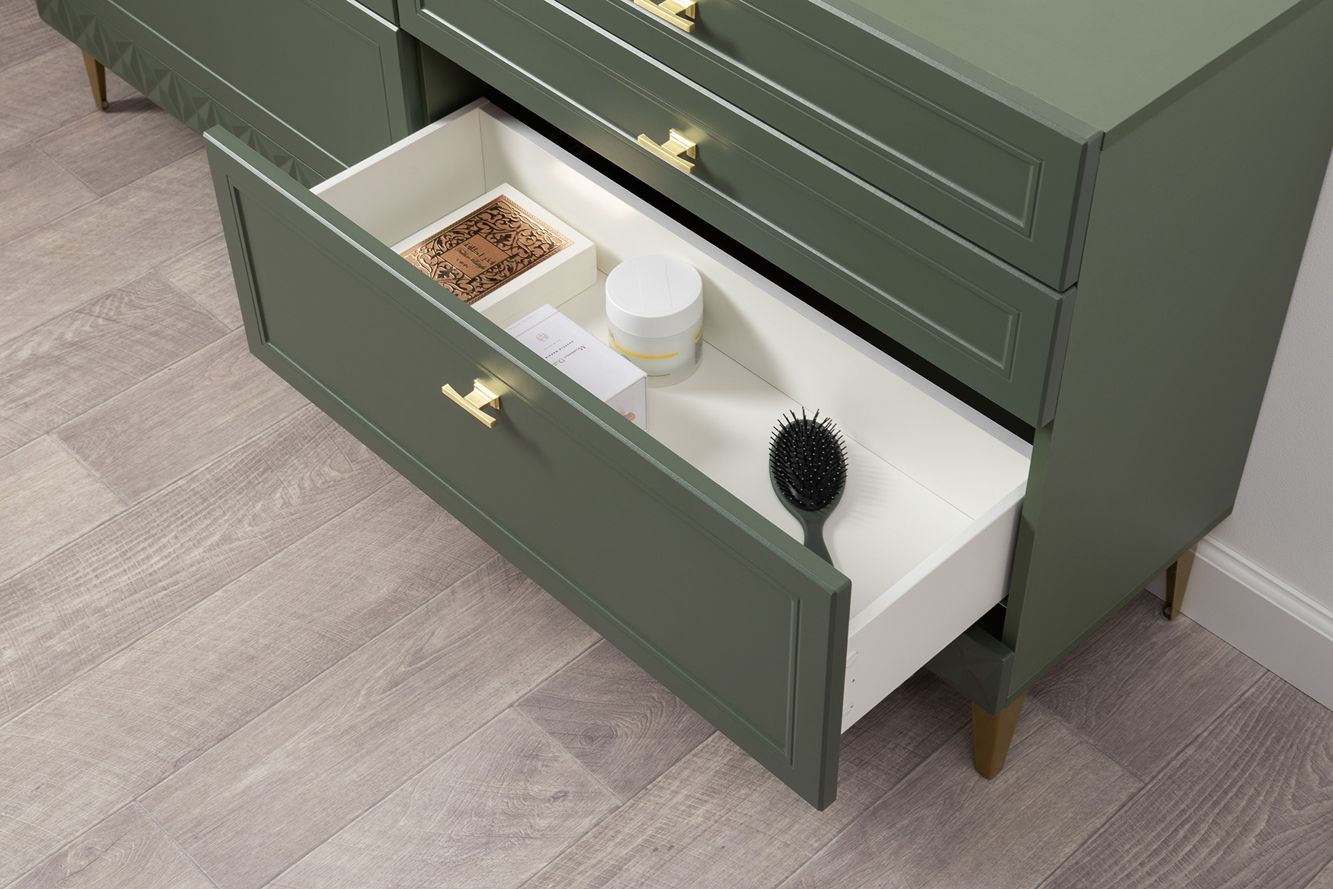 Комод Марион 16.256 дымчатый зеленый K521, олива шагрень AG 1050 ПВХ, белый PE шагрень
