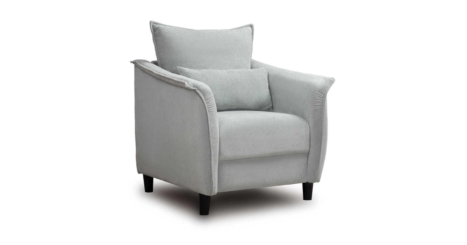 Кресло с приспинной подушкой трапецивидной формы на молнии, по трем сторонам которой проложена отделочная строчка на 1,2 см. По контуру боковин проложен декоративный кант на 1,2 см основной ткани. Кант проходит по центру передней части боковины, а по внутренней верхней части сборка.