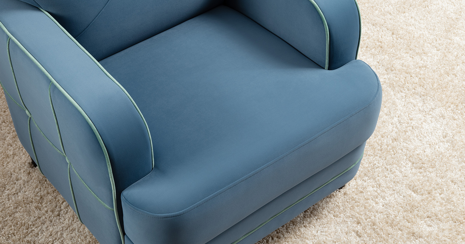 Декоративные канты на вставке подлокотников. Пуговицы в местах пересечения кантов на подушке и вставке подлокотников. По торцам подлокотников и думках контрастный декоративный кант. Защипы на сиденье и подушке.