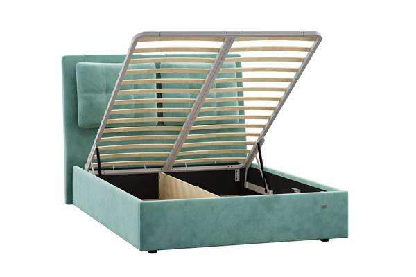 Подъемный механизм легок в управлении, а вместительный короб внутри кровати подойдет для хранения подушек, белья и других вещей.