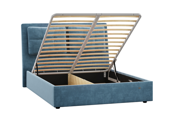 Подъемный механизм легок в управлении, а вместительный короб внутри кровати подойдет для хранения подушек, белья и других вещей.