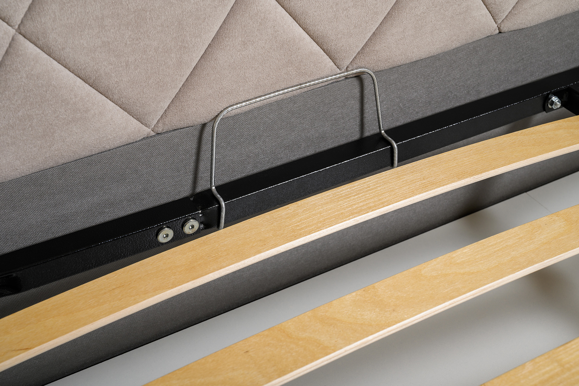 Основание кровати укомплектовано матрасодержателями. Жесткое кроватное дно из ЛДСП 16 мм на опорах 25 мм.
