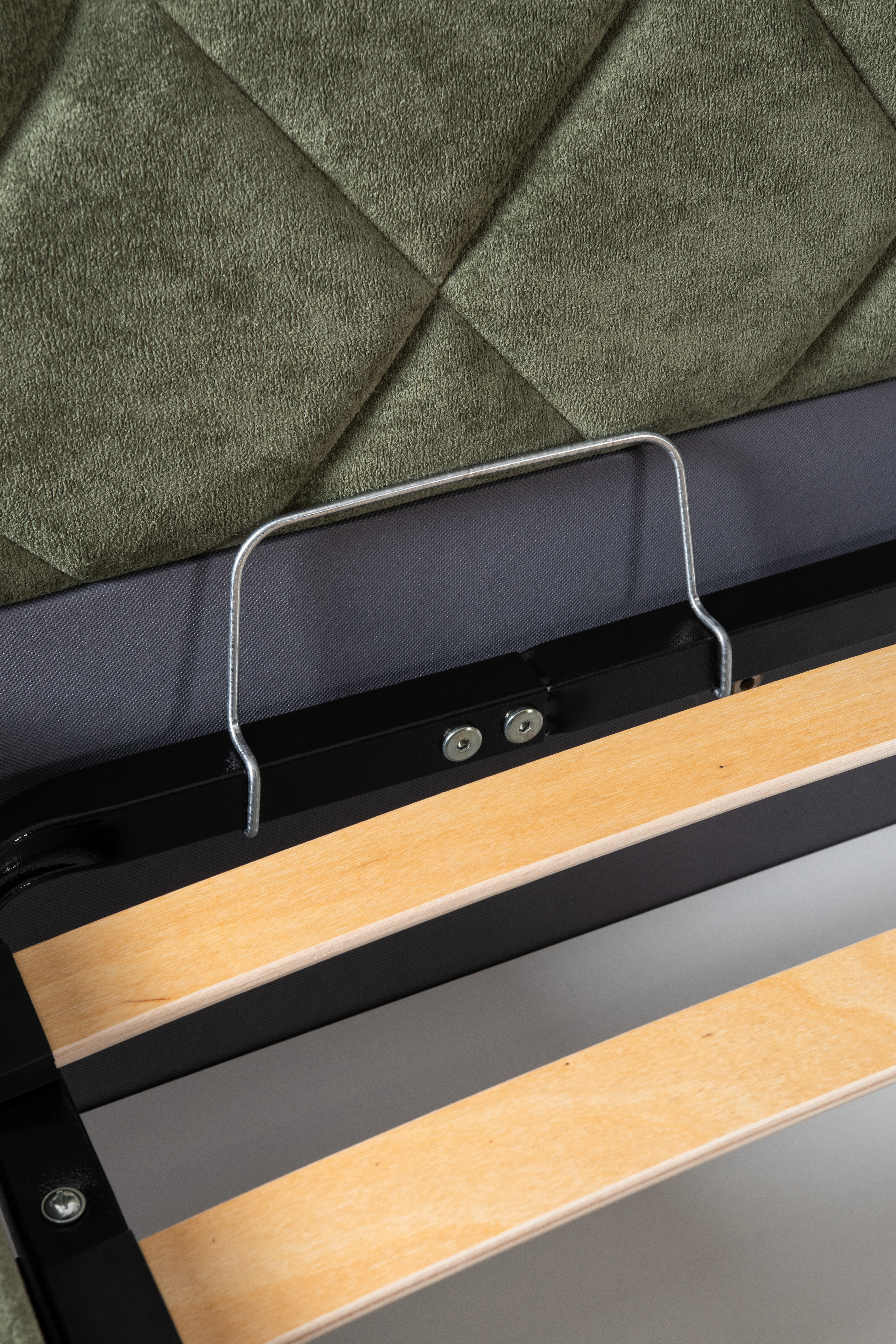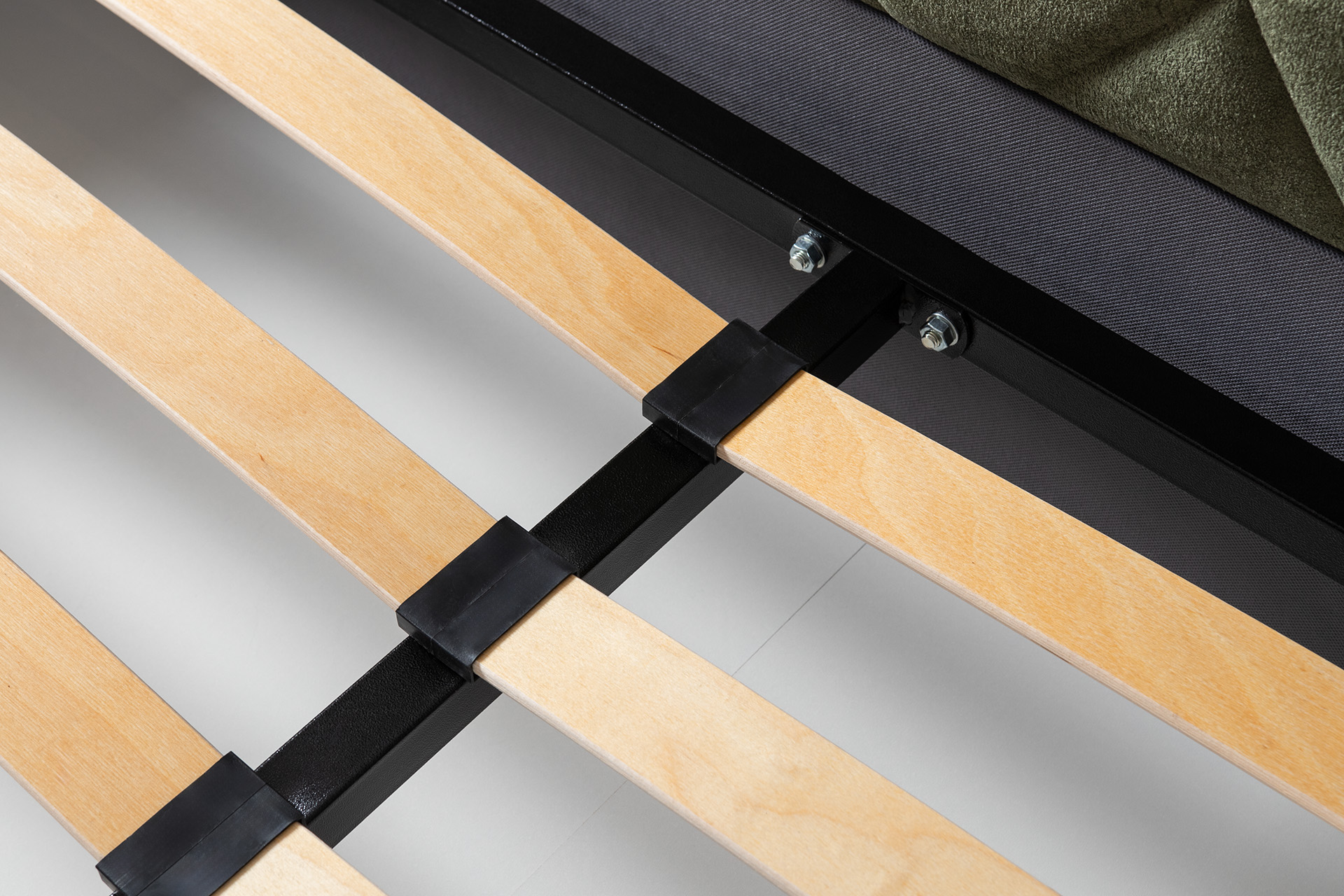 Основание кровати укомплектовано матрасодержателями. Жесткое кроватное дно из ЛДСП 16 мм на опорах 25 мм.
