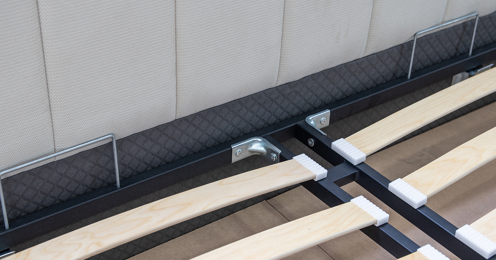 Основание кровати укомплектовано матрасодержателями. Жесткое кроватное дно из МДФ 6 мм. Задняя стенка изголовья выполнена в тех. ткани (спанбонд)