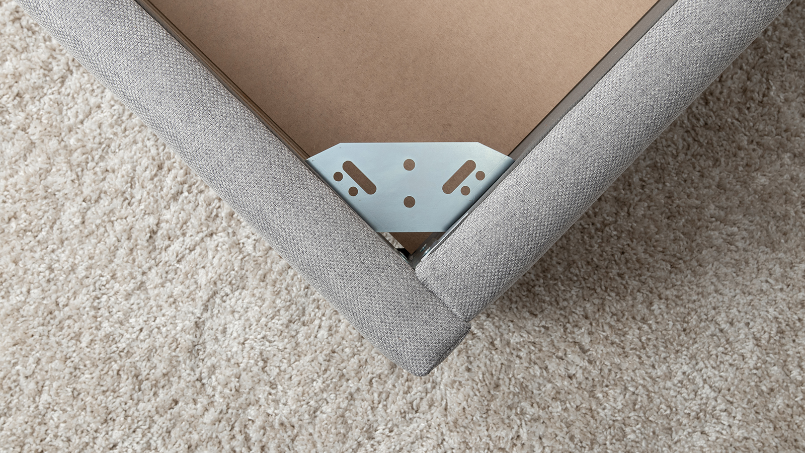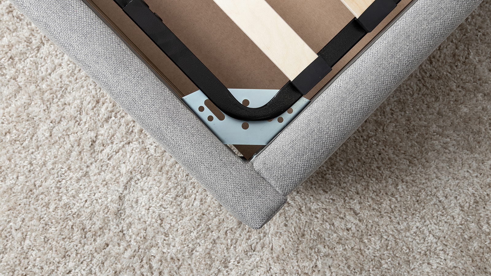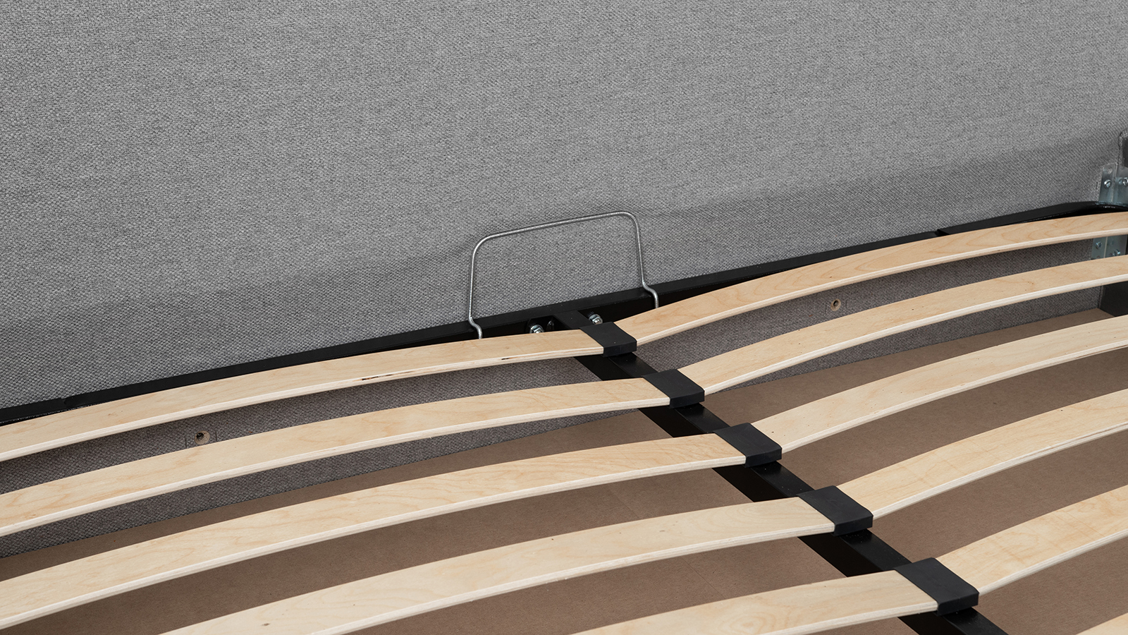 Основание кровати укомплектовано матрасодержателями. Жесткое кроватное дно из МДФ 6 мм. Задняя стенка изголовья выполнена в тех. ткани (спанбонд).