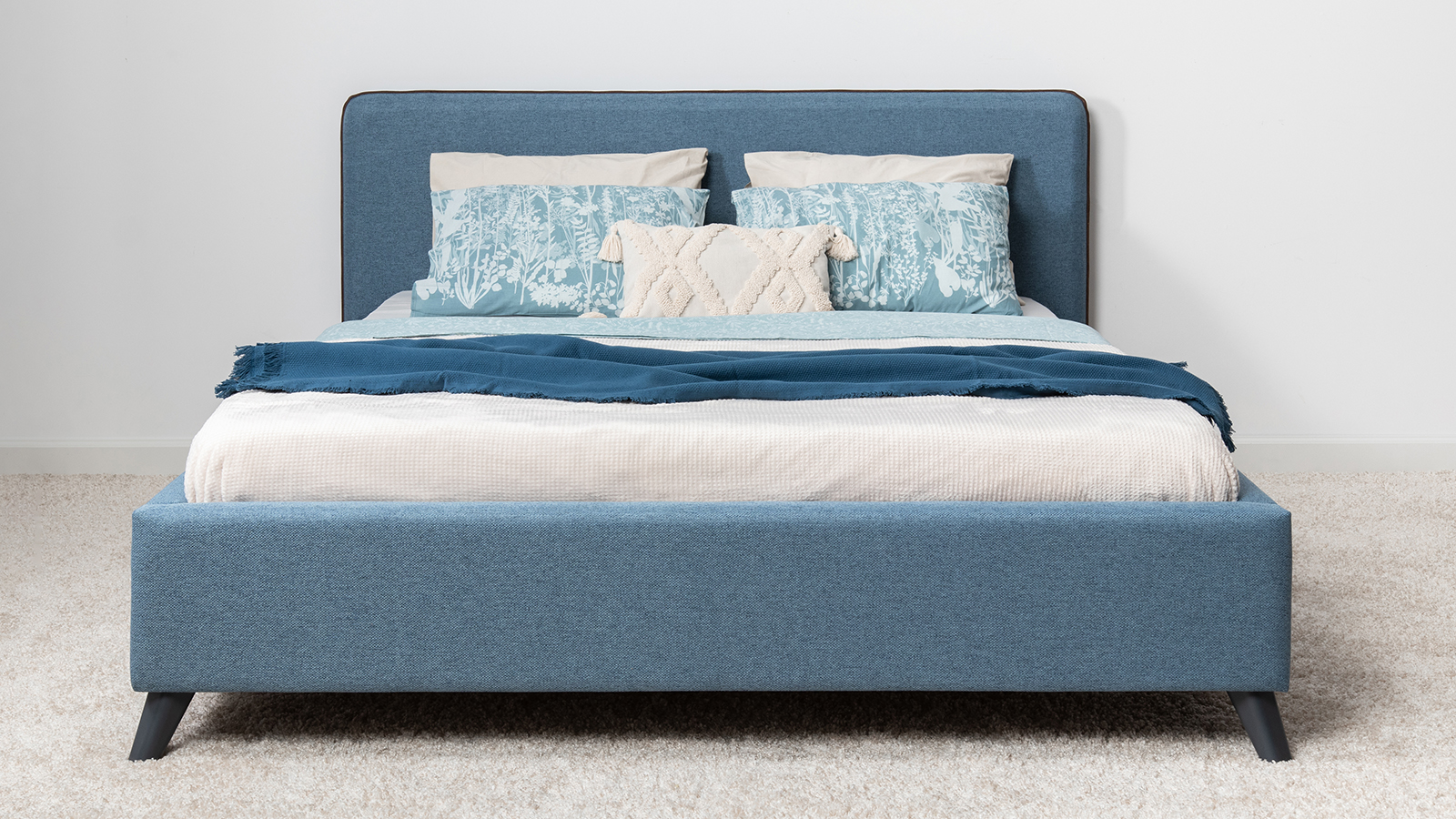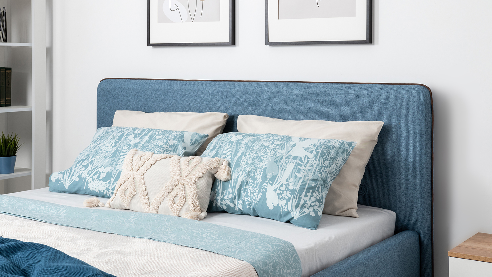 Cкругленный торец изголовья оформлен контрастным кантом.