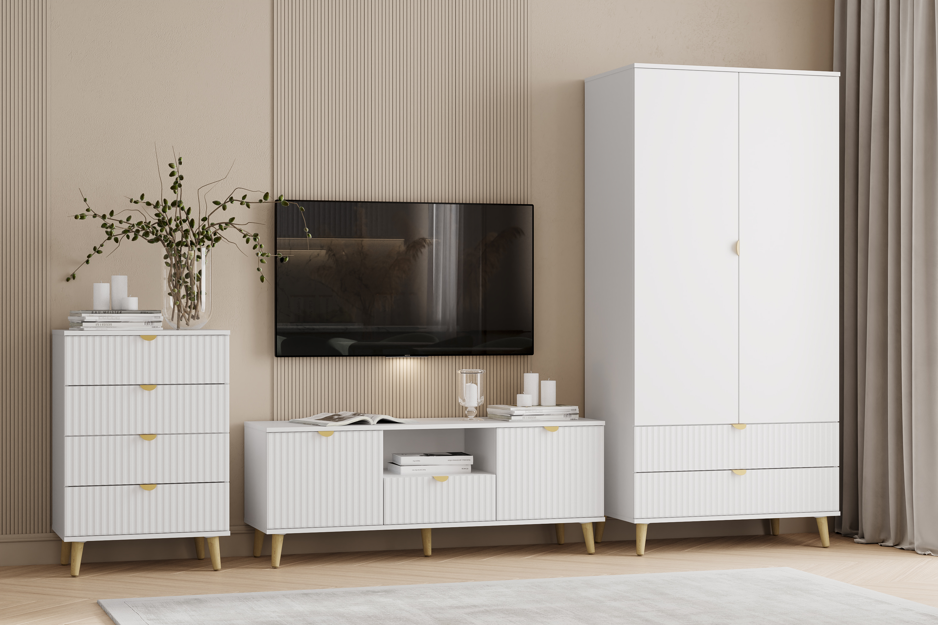 Шкаф оснащен двумя выдвижными ящиками, которые открываются плавно и бесшумно благодаря шариковым направляющим, полками, а также овальной штангой для организации предметов гардероба, а высокие опоры облегчают процесс уборки.