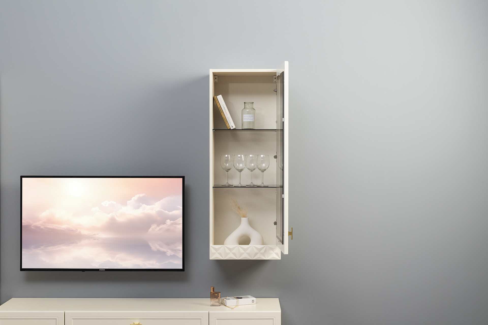 В коллекции представлены три типа витрин с тонированным закалённым стеклом, которые придают пространству лёгкость и свет. «Марион» — идеальное сочетание традиций и актуального дизайна в каждой детали.