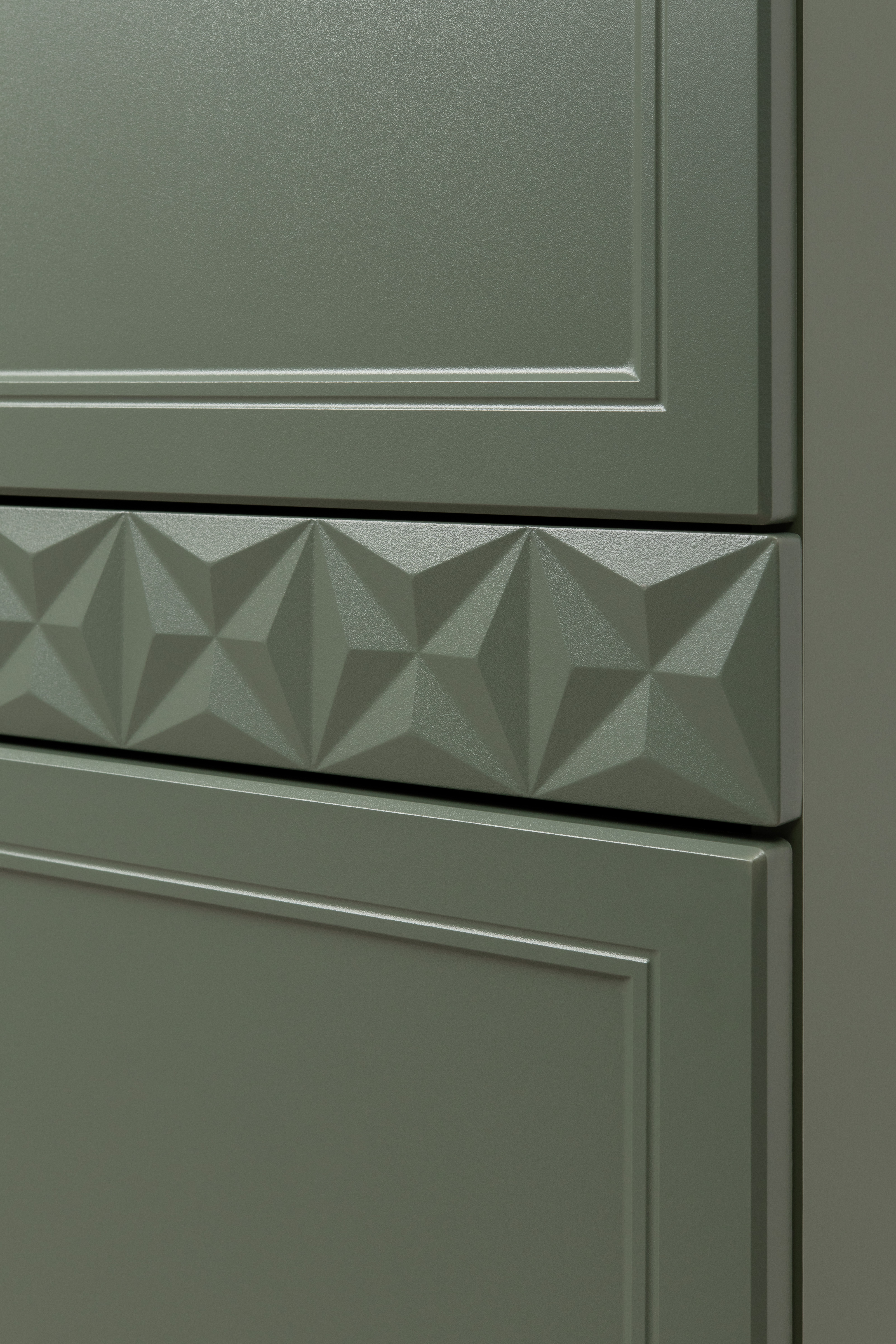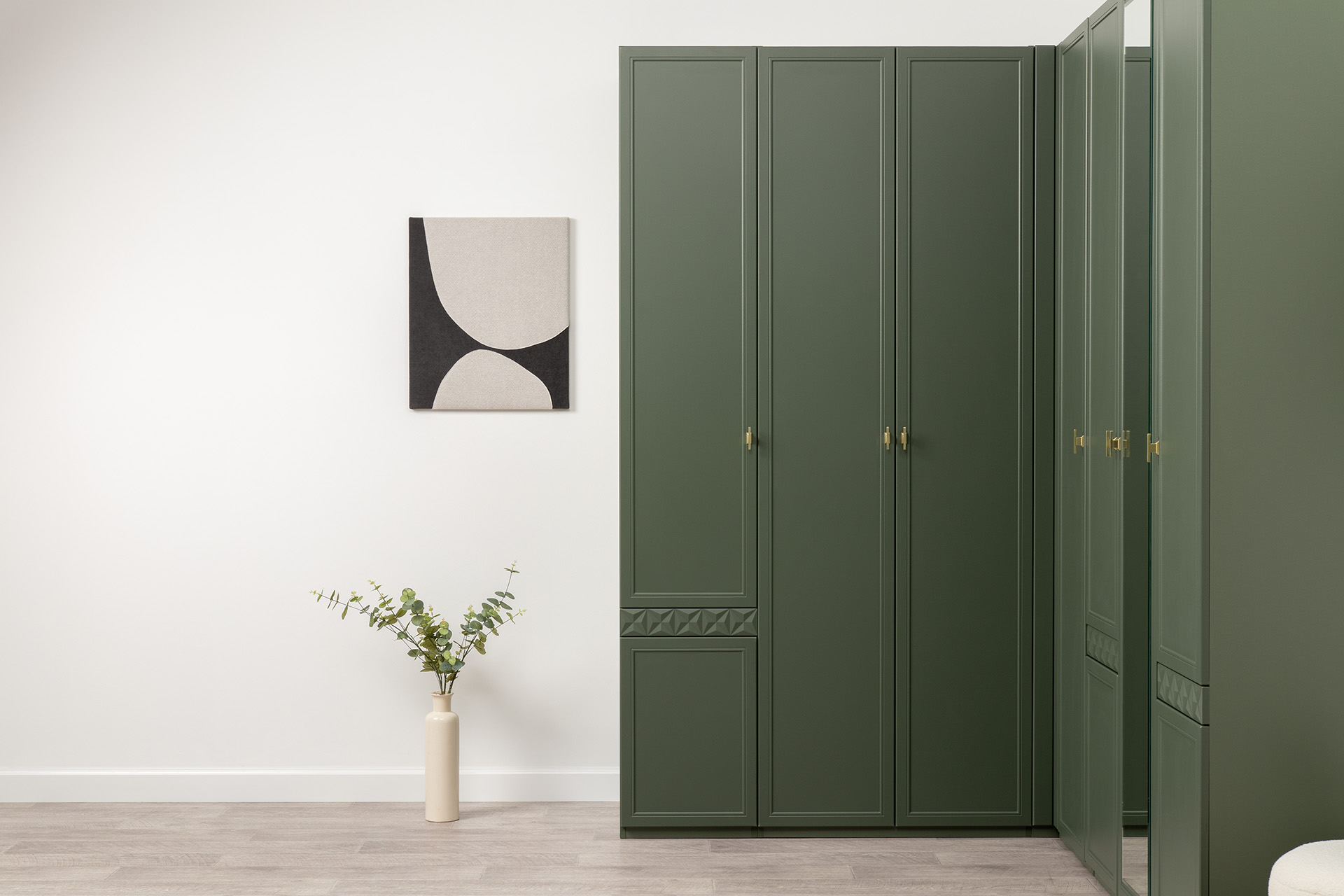 Изящные линии, глубокая фрезеровка фасадов из МДФ и благородные оттенки. Утончённая «Слоновая кость» и изысканная «Олива Шагрень» с глубоким зелёным тоном — создают атмосферу уюта, тепла и благородства. Металлические ручки и опоры золотого цвета придают мебели утончённый блеск, а петли и направляющие с доводчиками обеспечивают плавное и бесшумное закрытие фасадов.