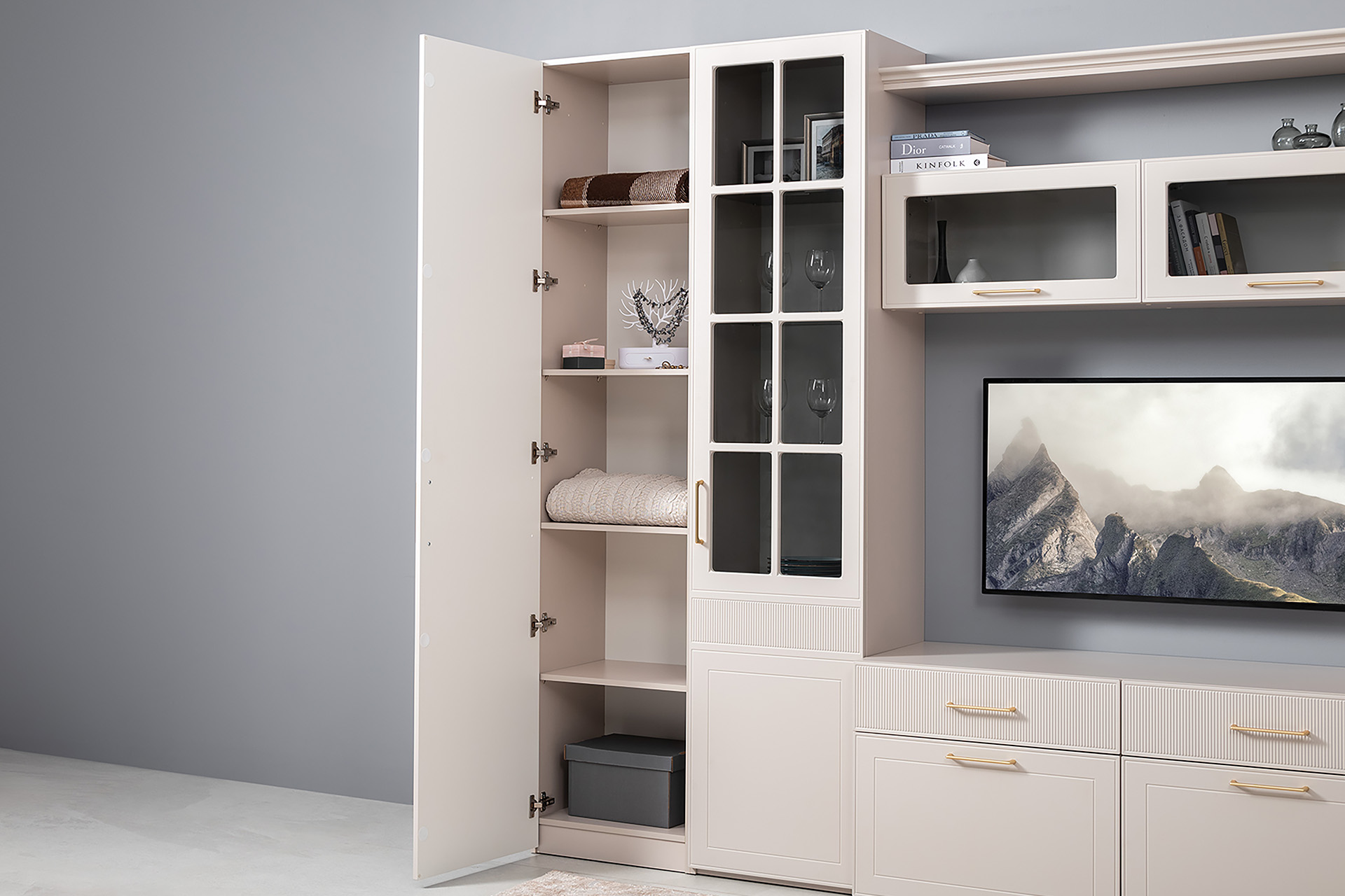 Шкаф-витрина в гостиную Ливерпуль белый, ясень ваниль ПВХ