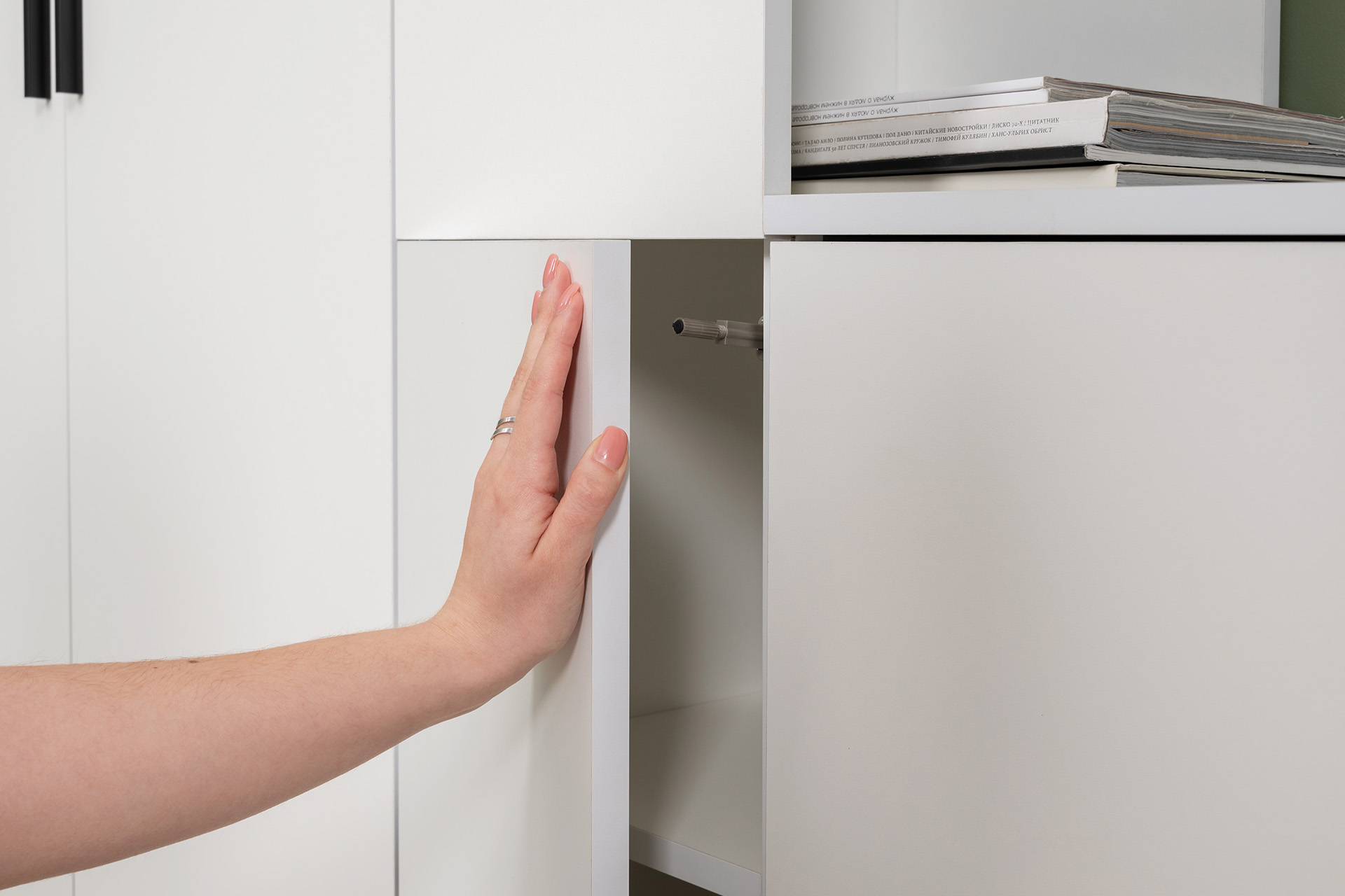 Модули универсальны и сочетаются между собой. Открытые и закрытые ниши для хранения, защитные пластиковые демпферы, съемные полки, направляющие полного выдвижения в ящиках – комфорт продуман до мелочей.