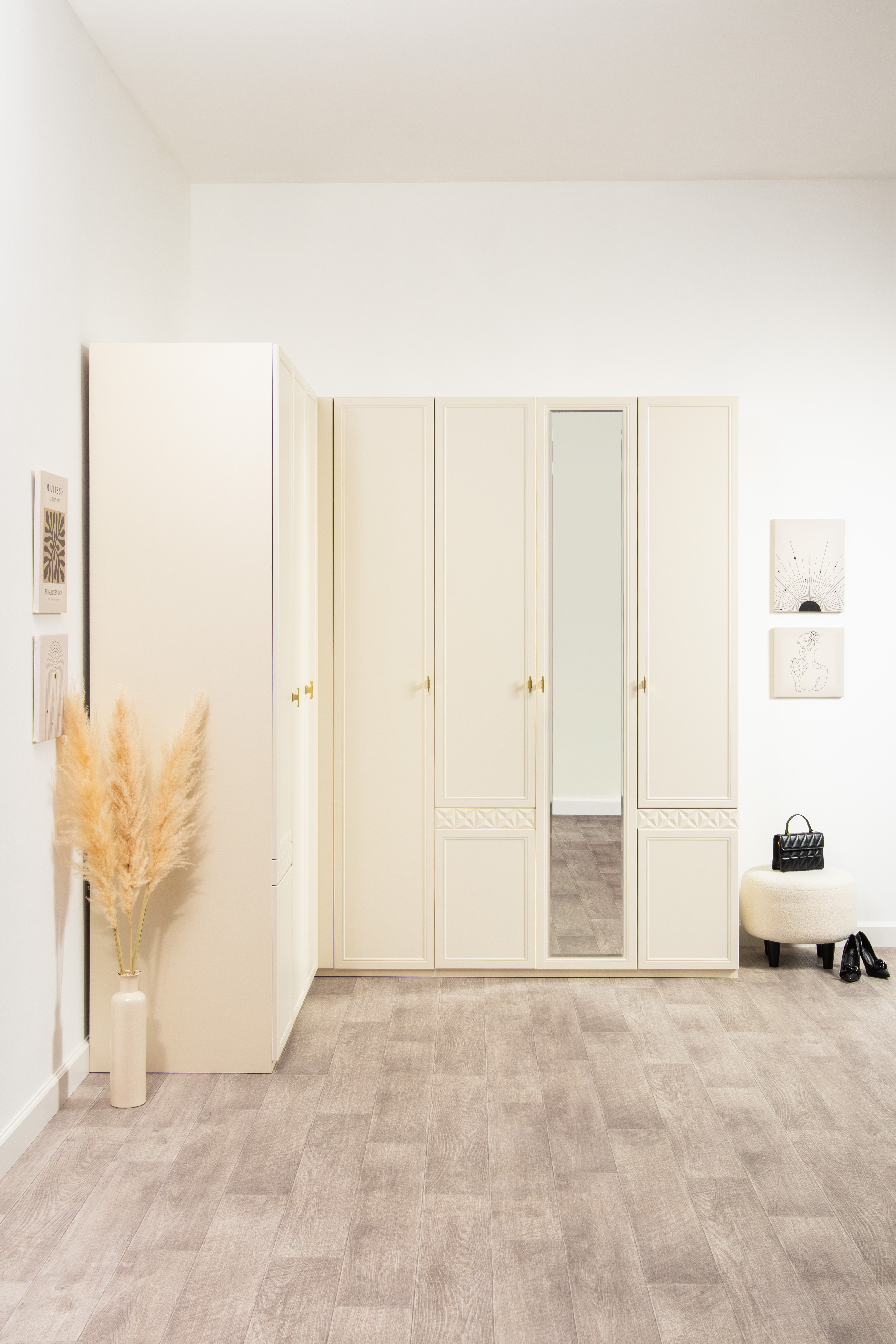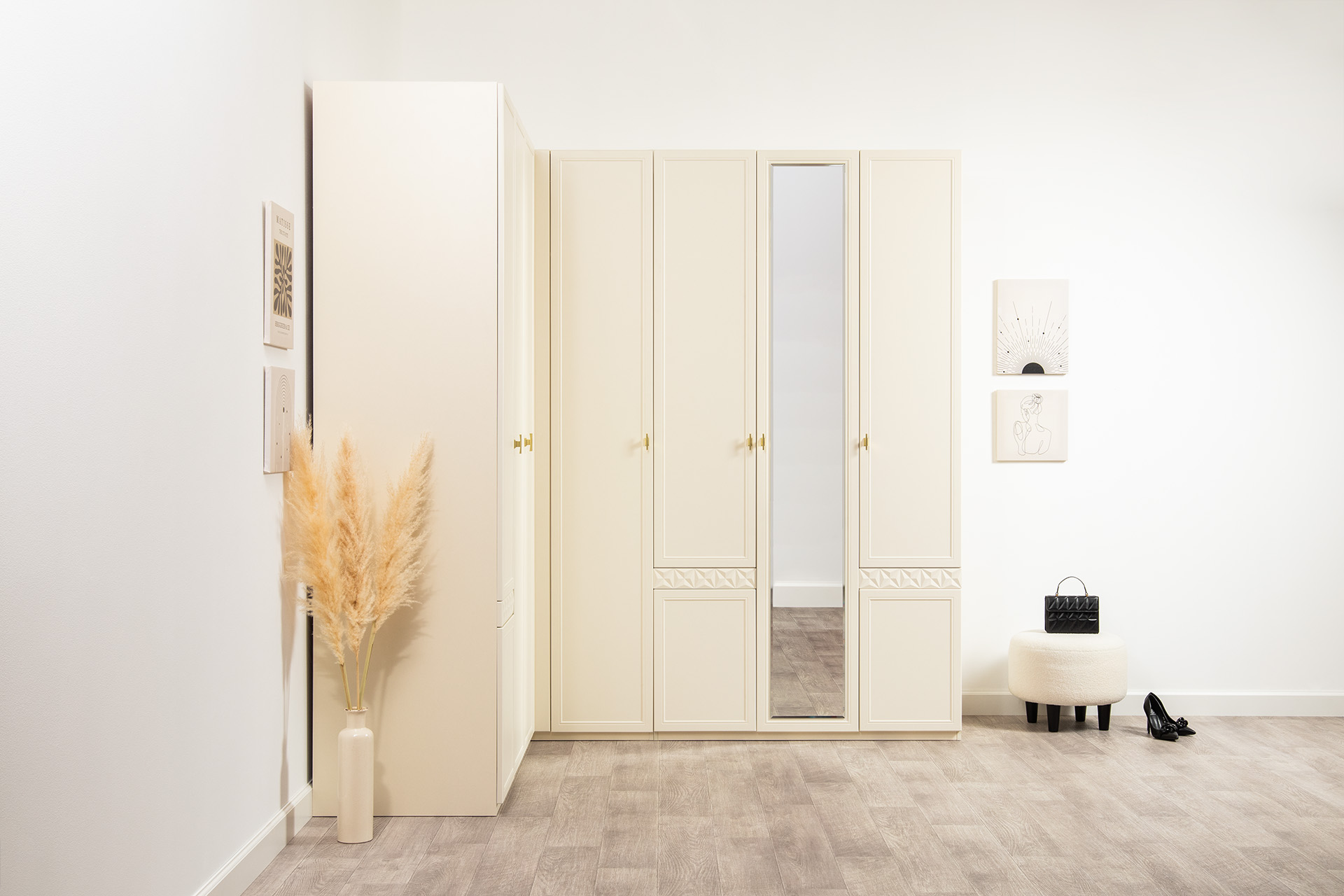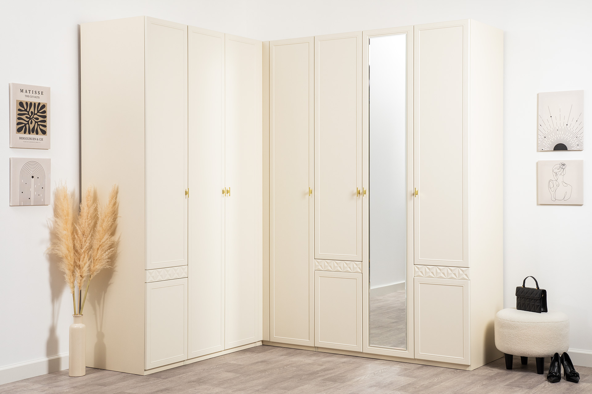 Изящные линии, глубокая фрезеровка фасадов из МДФ и благородные оттенки. Утончённая «Слоновая кость» и изысканная «Олива Шагрень» с глубоким зелёным тоном — создают атмосферу уюта, тепла и благородства. Металлические ручки и опоры золотого цвета придают мебели утончённый блеск, а петли и направляющие с доводчиками обеспечивают плавное и бесшумное закрытие фасадов.