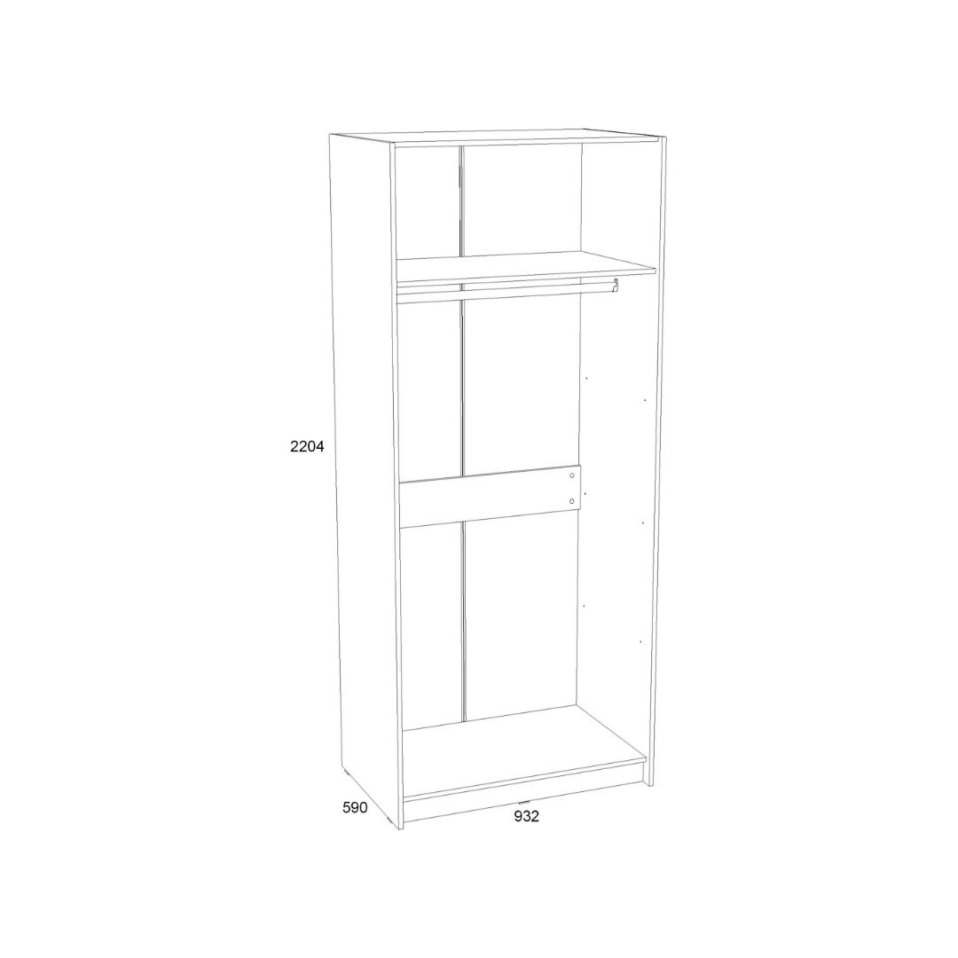 НМ 014.03 Шкаф для одежды. Габаритные размеры (ШхГхВ): 93,2 х 59 х 220,4. Предназначен для хранения одежды, навешанной на плечики, а также в сложенном состоянии на его внутренних полках. Представляет собой каркас из панелей ЛДСП со стяжной горизонтальной панелью. В отделении за двумя распашными дверями полка для одежды и овальная штанга. Шкаф может комплектоваться как двумя дверями ЛДСП, так и сочетанием одной дверью ЛДСП и одной дверью ЛДСП с наклеенным зеркалом. Изделие стандартной сборки. Фурнитура: - Опора наконечник черный, - Петля вкладная 90 с доводчиком Boyard (H302C02/2410), - Ручка СА-1 96 Алди черный. В качестве крепежа используются шканты и эксцентриковые стяжки. Все видимые отверстия закрываются заглушками в цвет корпуса. Шкаф укомплектован двумя уголками Овербаланс для крепления к стене и двумя межсекционными стяжками для соединения в композицию.